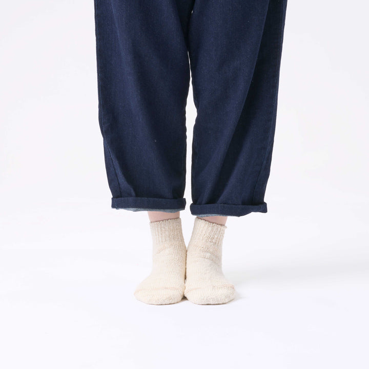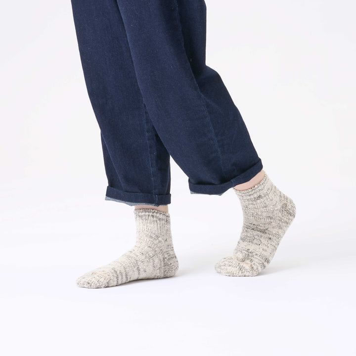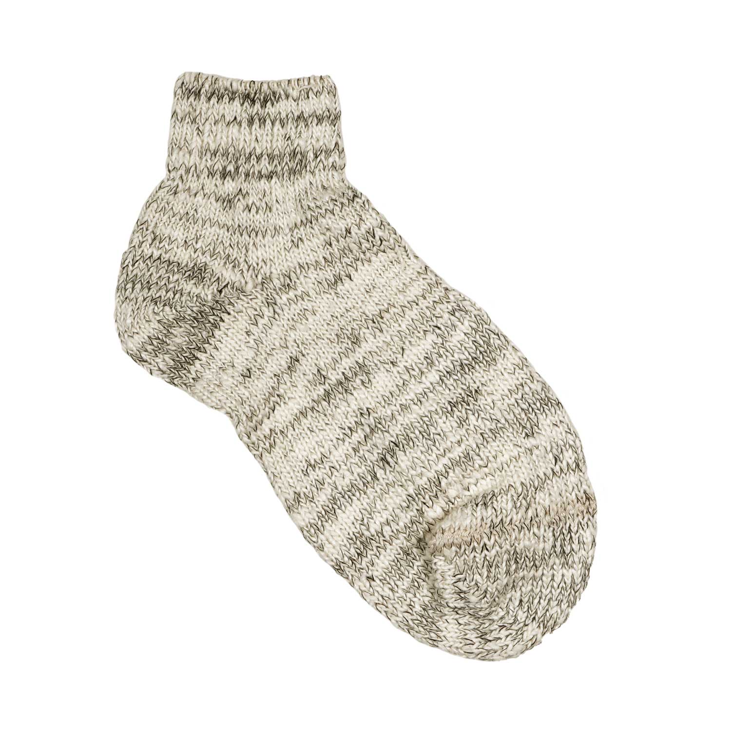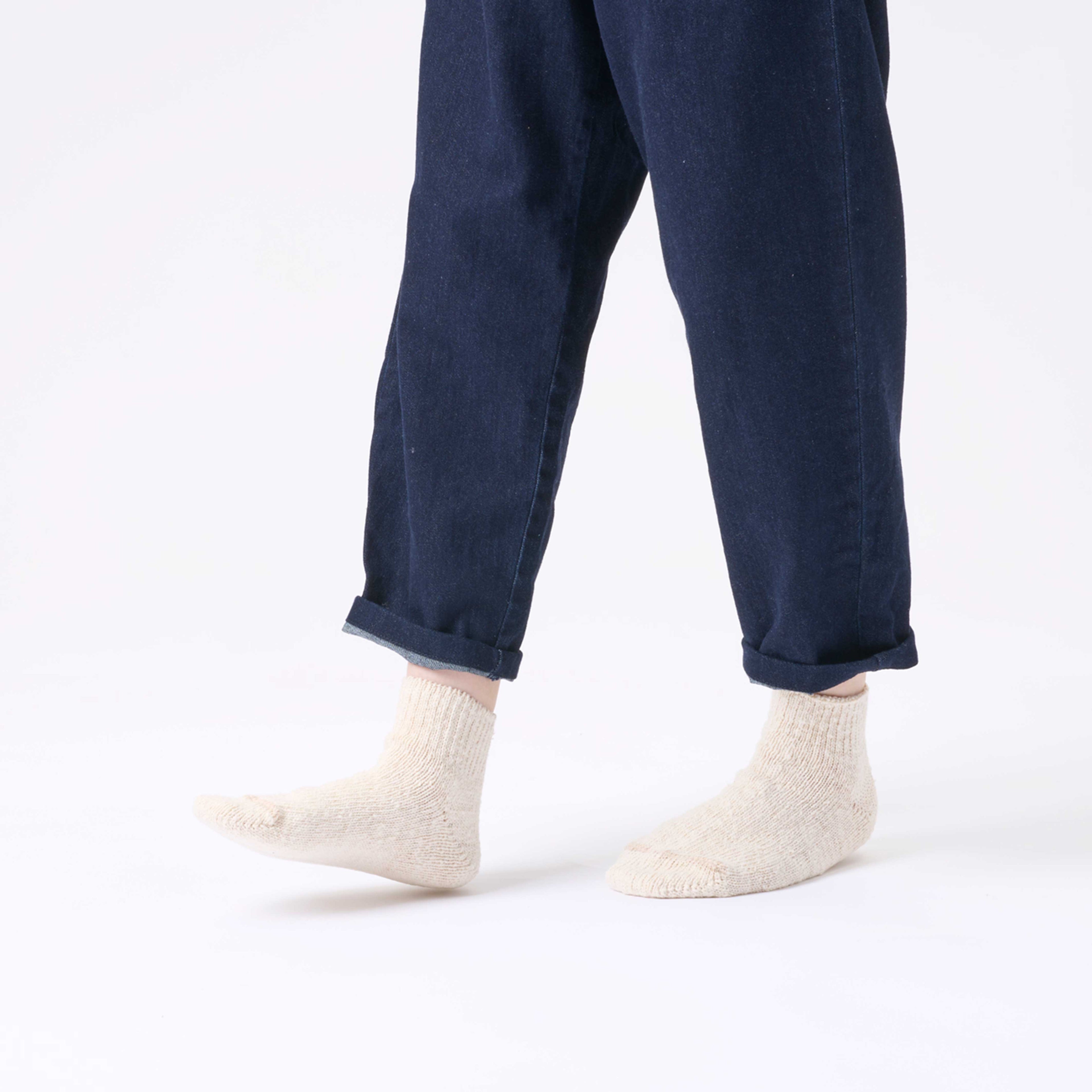 明治時代に日本で開発され今では希少となった紡績機・ガラボウで紡いだ綿糸を、リネンの糸と引き揃え丁寧に編み立てました。手紡ぎのような不均等な糸から作られたソックスは、一枚一枚表情が異なるためそれぞれ一点物のような仕上がりになります。