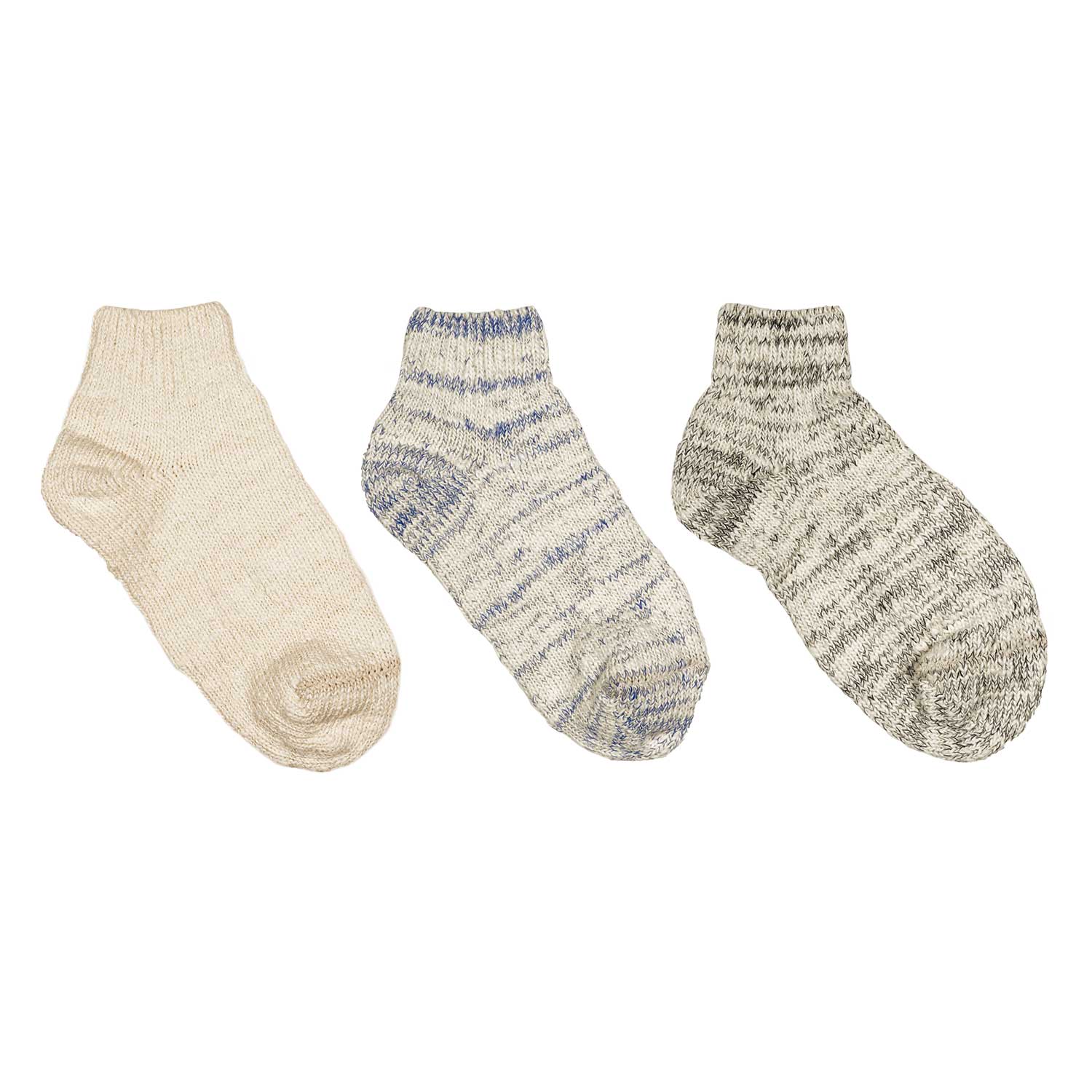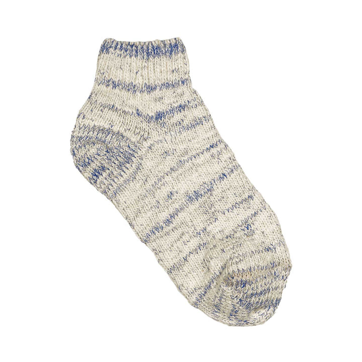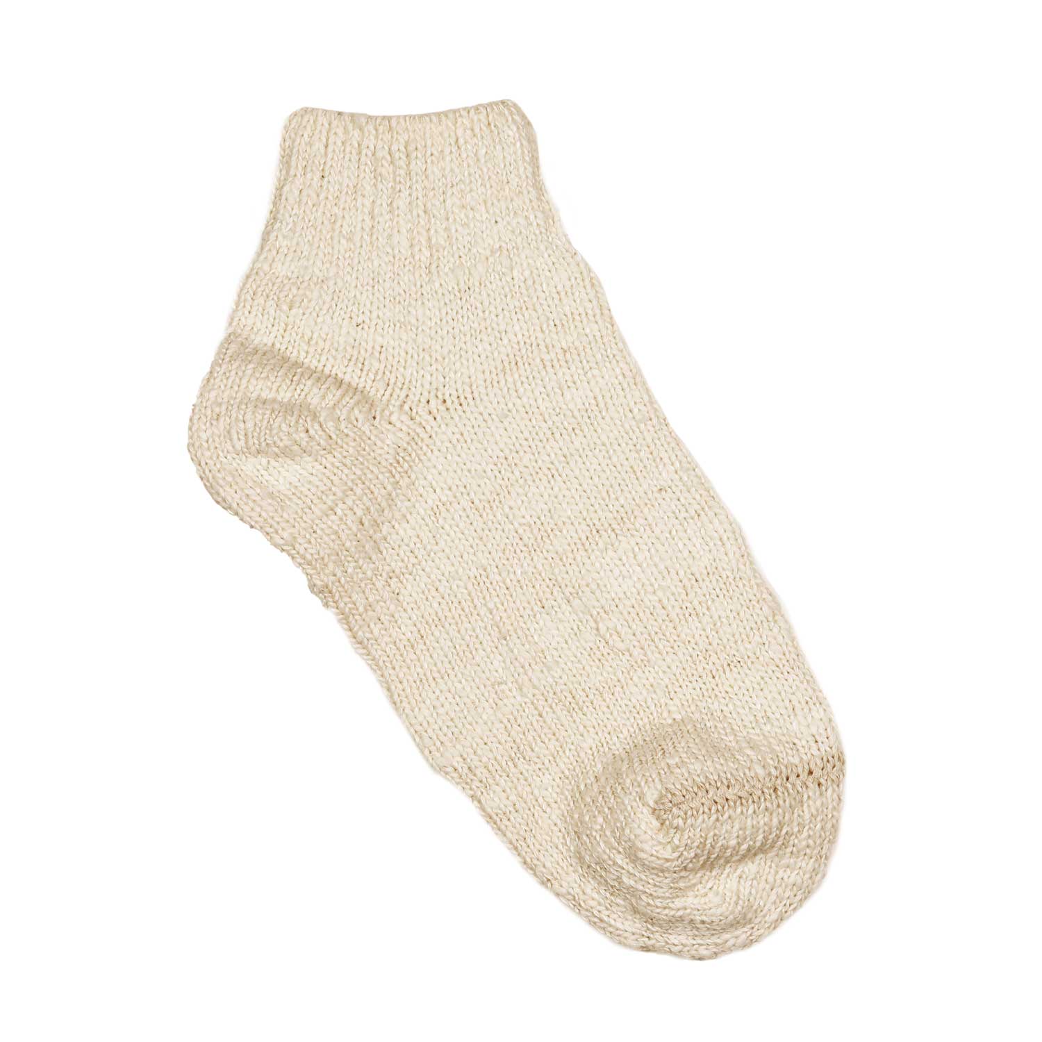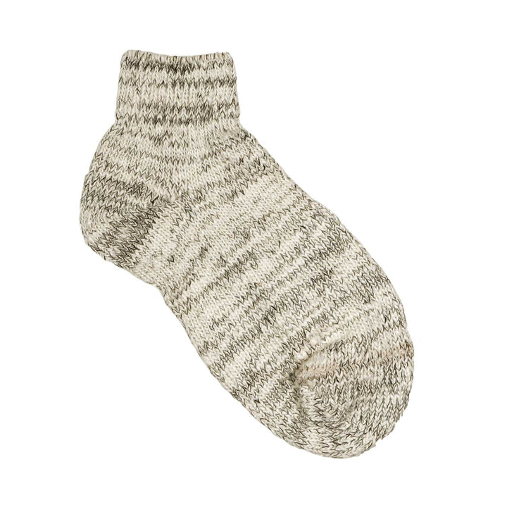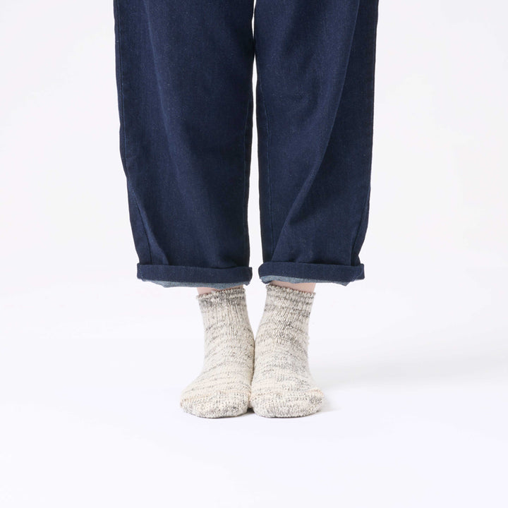 明治時代に日本で開発され今では希少となった紡績機・ガラボウで紡いだ綿糸を、リネンの糸と引き揃え丁寧に編み立てました。手紡ぎのような不均等な糸から作られたソックスは、一枚一枚表情が異なるためそれぞれ一点物のような仕上がりになります。