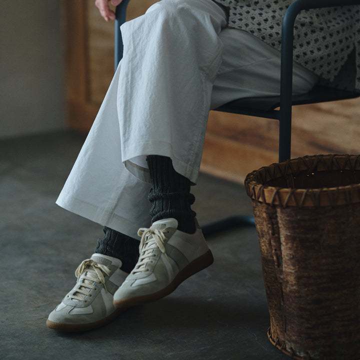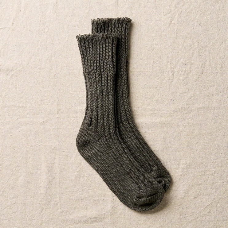 イギリス ベントレー社の古いヴィンテージマシーンで編み立てた、昔ながらの風合いのあるローゲージソックス。五倍子染めの糸をたくさん使いゆっくりと編み上げた、手編みのような優しい履き心地です。五倍子染めとは、ウルシ科の植物にできる「むしコブ」 を原料とした天然の染めです。多くのタンニンが含まれ、それ真っ黒とは異なる深みのあるグレーの発色です。JIS規格をクリアした抗菌作用を持つので足元を快適に包みます。