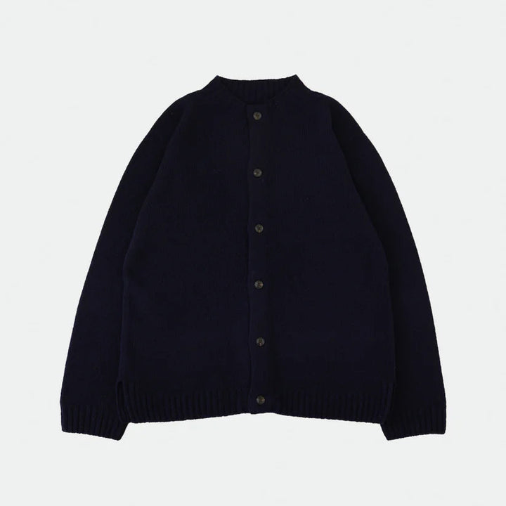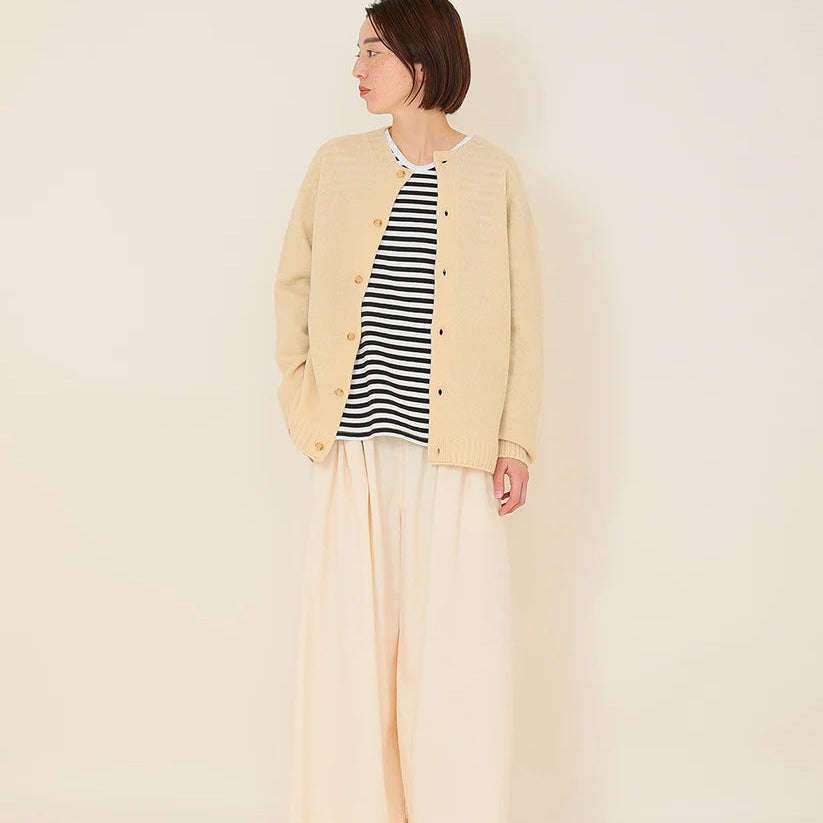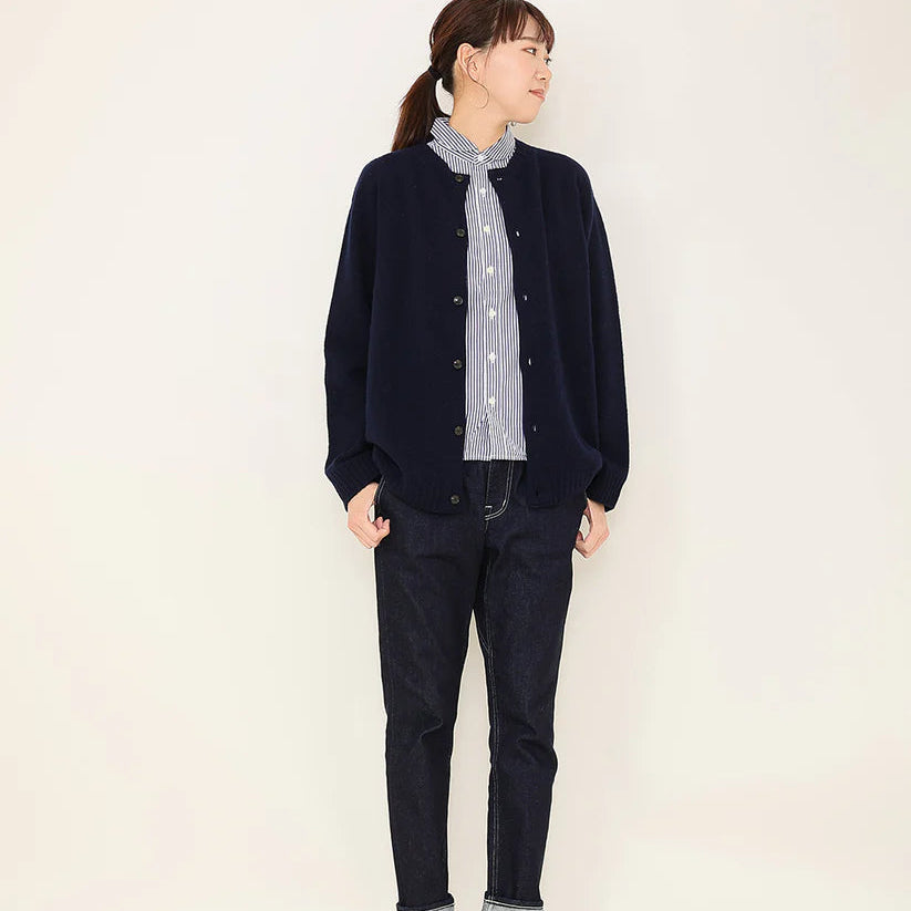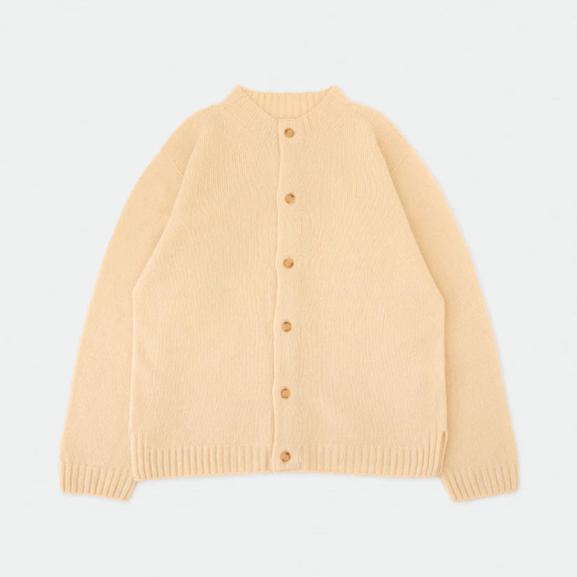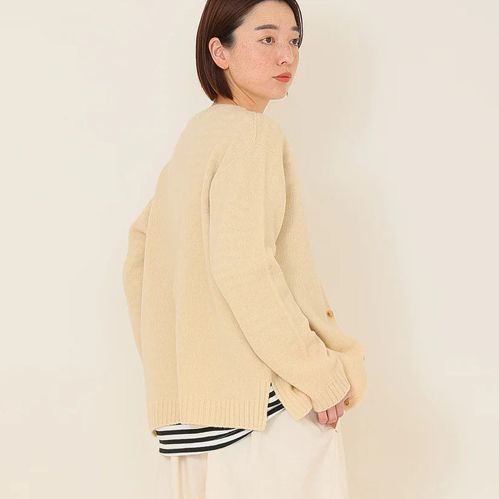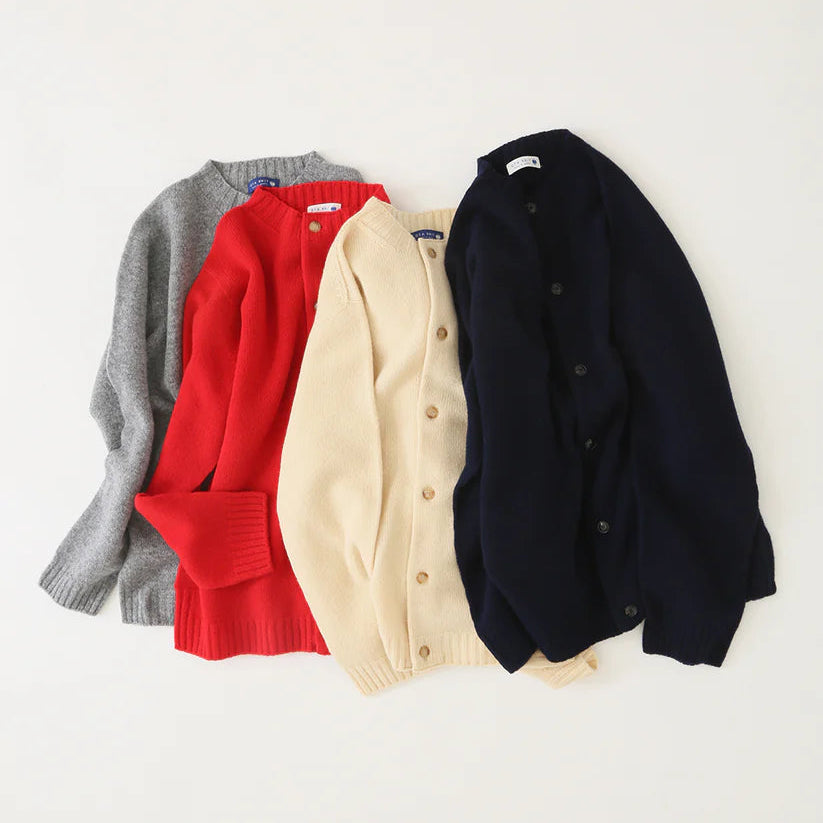 厳選されたオーストラリア産ウールを100%使用した紡毛糸です。従来のウールより軽く、ふくらみと柔らかさが特徴のユニセックスサイズのカーディガンです。ニットの産地、群馬県太田市がより良いものづくりを掲げて生産するOTA KNIT(おおたニット)。ふんわりと柔らかく、チクチク感のない心地よい肌触りで心まで温めてくれるような、優しい着用感。しっかりとした編地は長年培われた技術だからこそ、安心してご使用頂けます。アームホールにマチを施し通常のニットより着心地に余裕を持たせました。男女兼用のユニセックスサイズ展開なので、あえてオーバーサイズをアウター感覚で着こなしたり。ゆったりサイズなので、すっきりとしたボトムが合います。