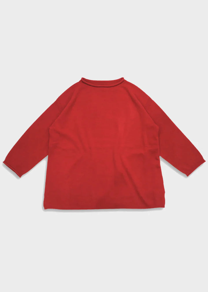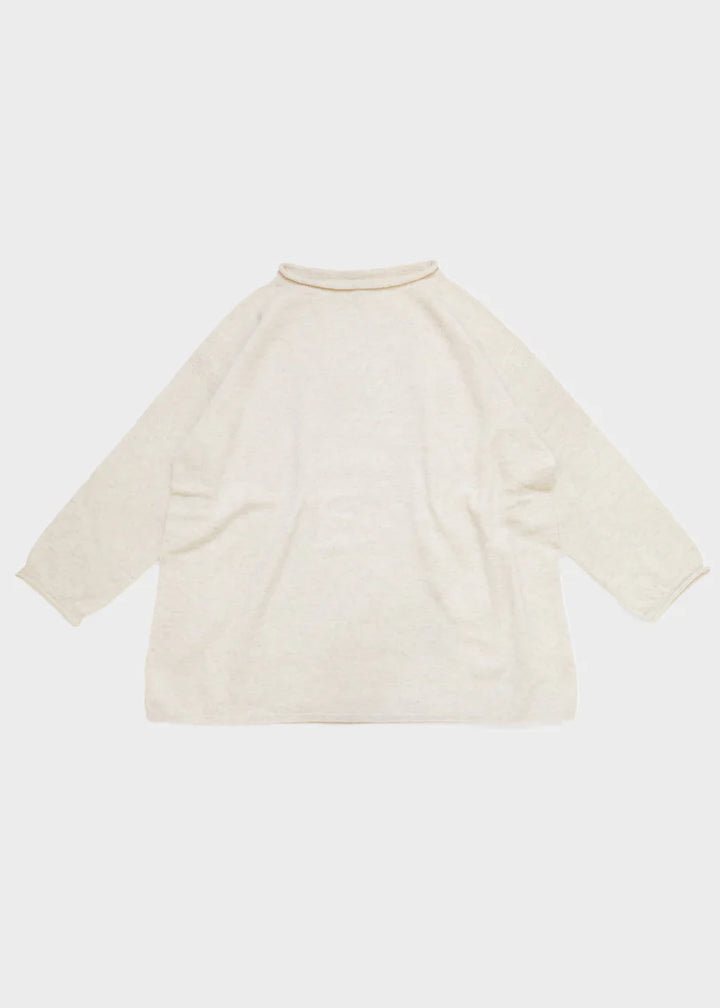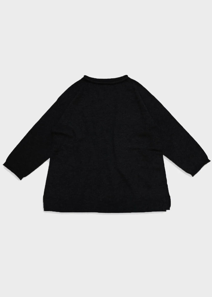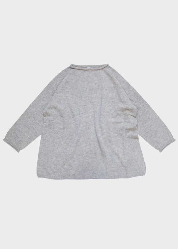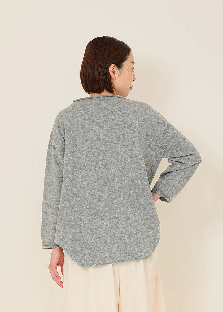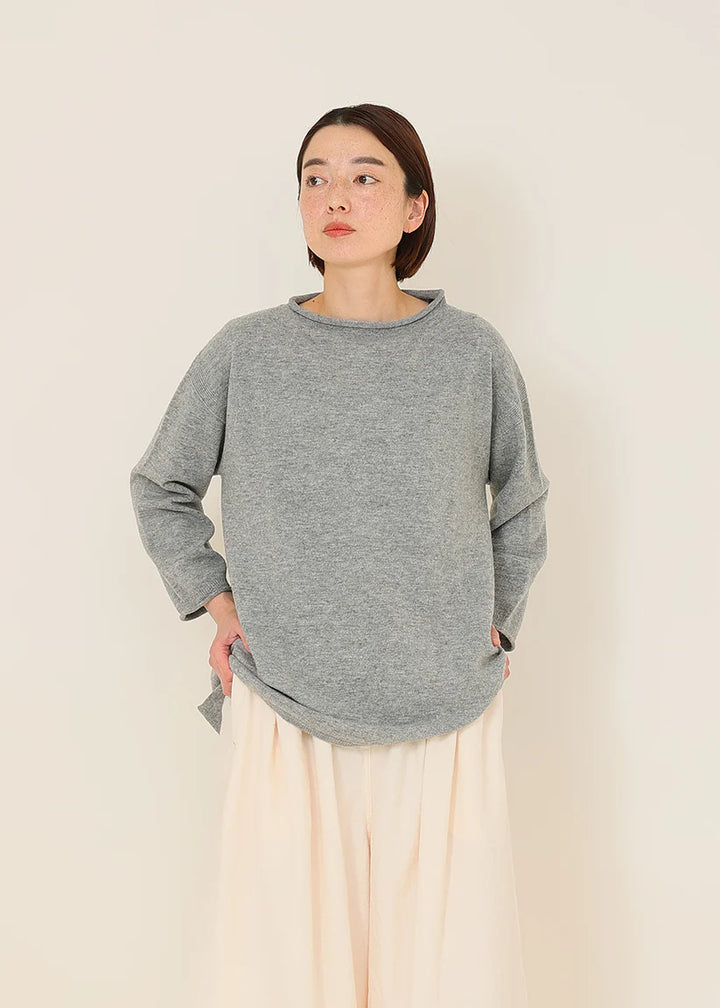 細番手のファインラムを使用した紡毛糸、定番素材です。ソフトで着心地が良くちょうど良い厚さで、秋冬の重ね着にも万能なデザインは、定番のアイテムとして活用できます。(OTA KNIT/太田市製ホールガーメント)くるんと丸くなった襟ぐりと袖口。シンプルなシルエットのポイントになってます。ゆったりした身幅とお尻にかかる着丈は着る人を選ばない万能ニットです。