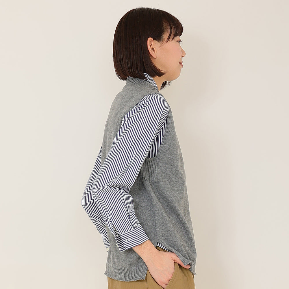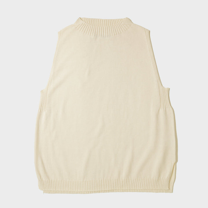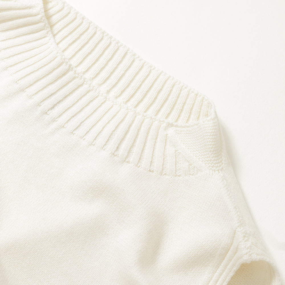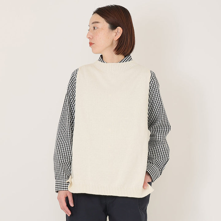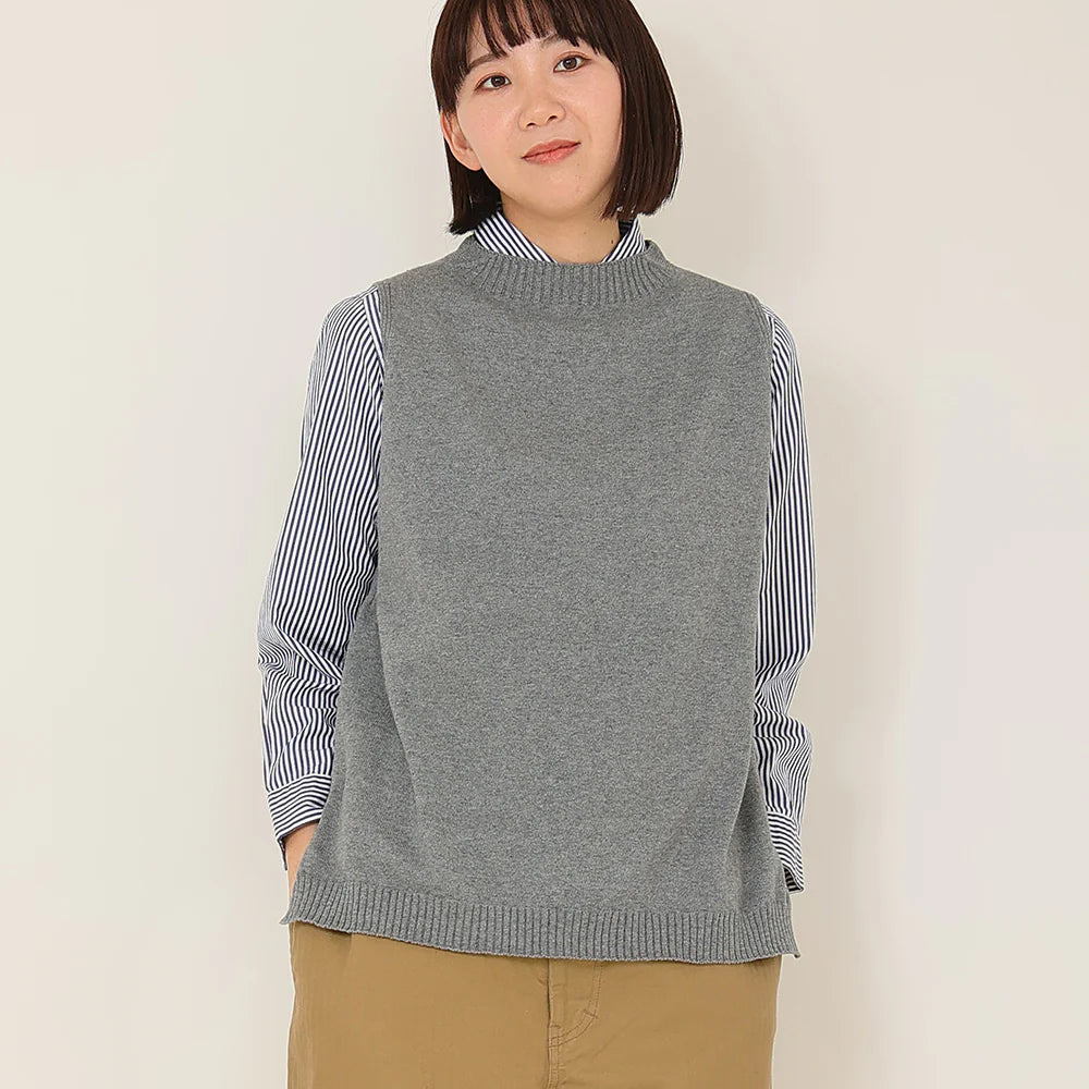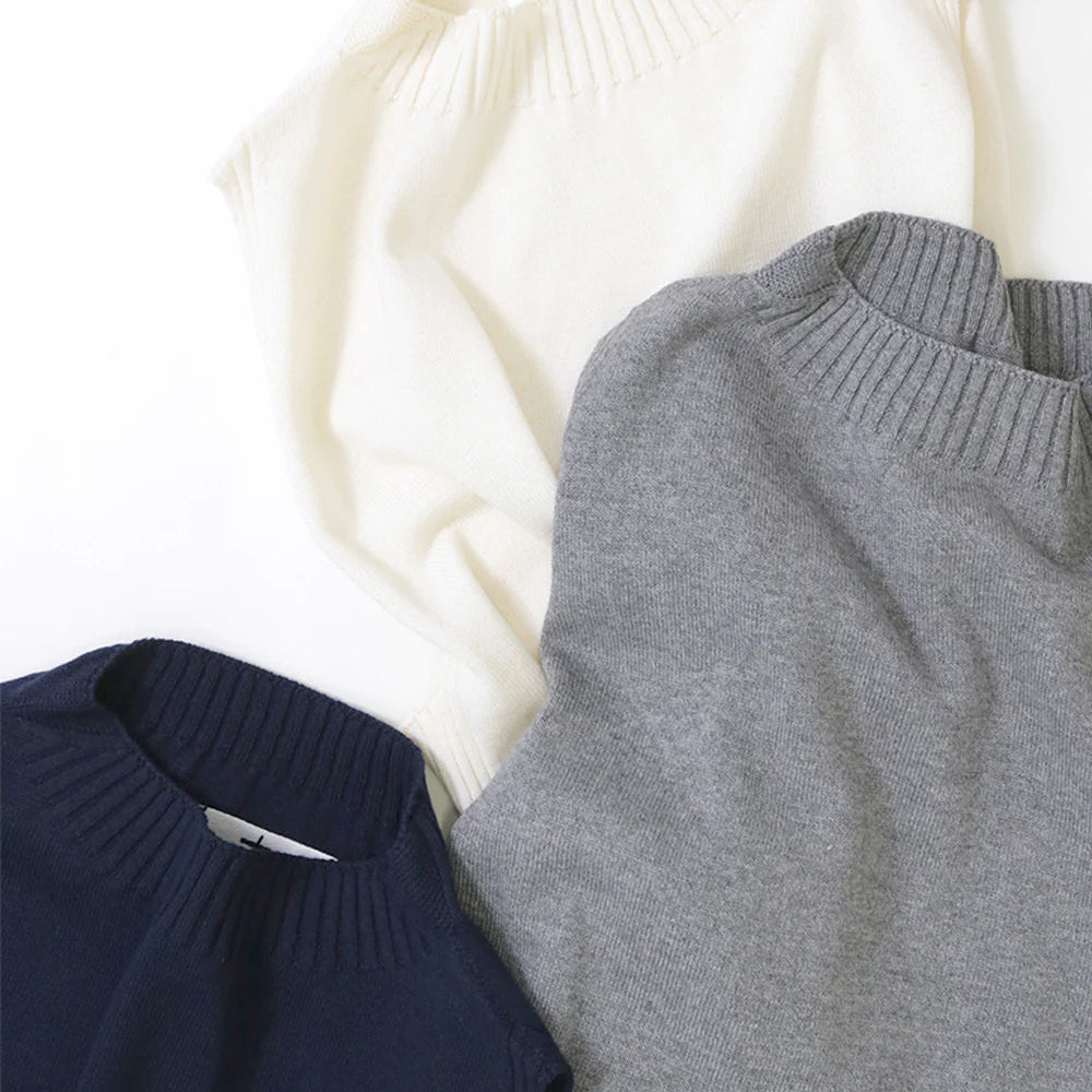 コットンに、落ち棉(おちわた)とカシミヤをブレンドした糸を使用。綿の取り扱いやすさに加え、カシミヤのタッチをほんのり感じられる素材なので秋口のまだ少し暖かい時期でも、活躍できる素材です。手洗い可能。(OTA KNIT/太田市製ホールガーメント)ボトルネックのシンプルなベスト。重ね着しやすいよう、アームホールにゆとりがあります。サイドスリット入り。