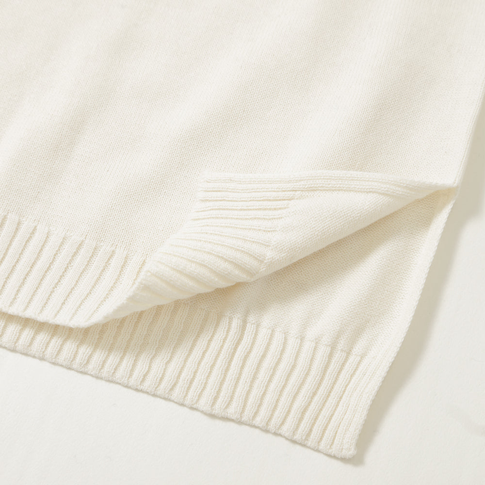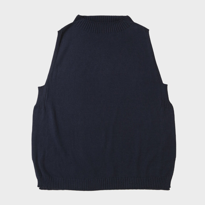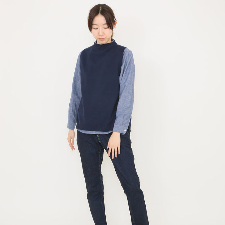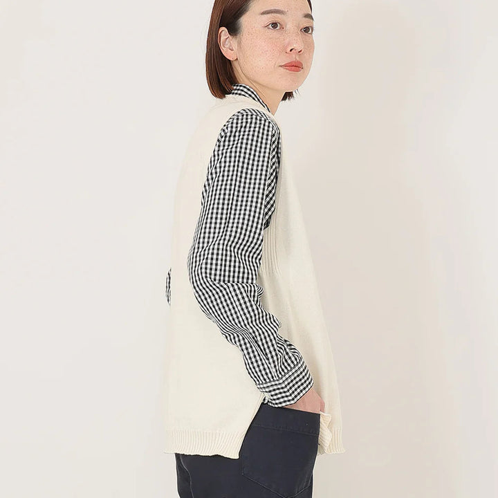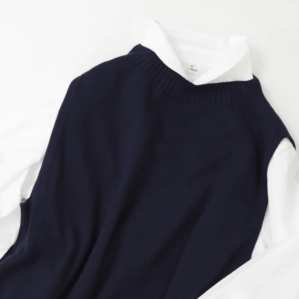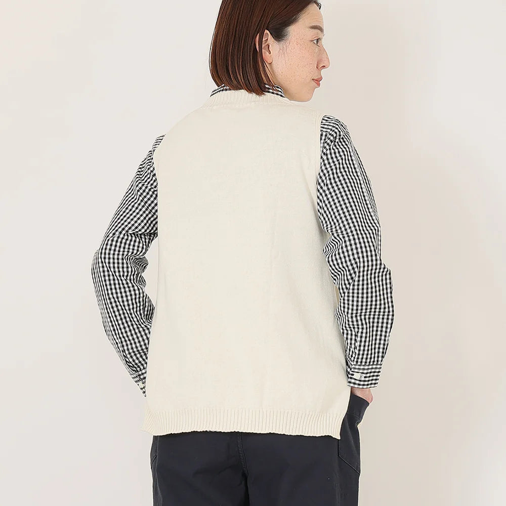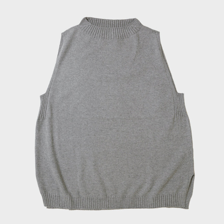 コットンに、落ち棉(おちわた)とカシミヤをブレンドした糸を使用。綿の取り扱いやすさに加え、カシミヤのタッチをほんのり感じられる素材なので秋口のまだ少し暖かい時期でも、活躍できる素材です。手洗い可能。(OTA KNIT/太田市製ホールガーメント)ボトルネックのシンプルなベスト。重ね着しやすいよう、アームホールにゆとりがあります。サイドスリット入り。
