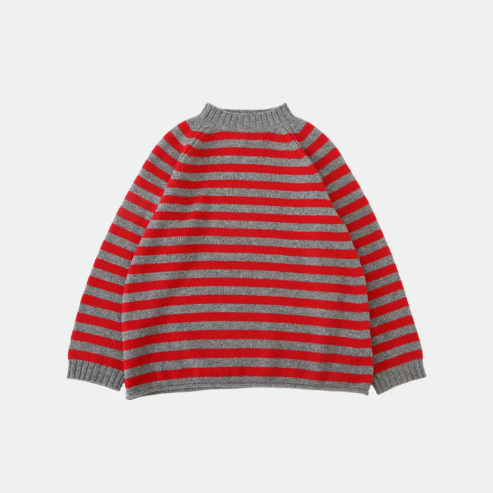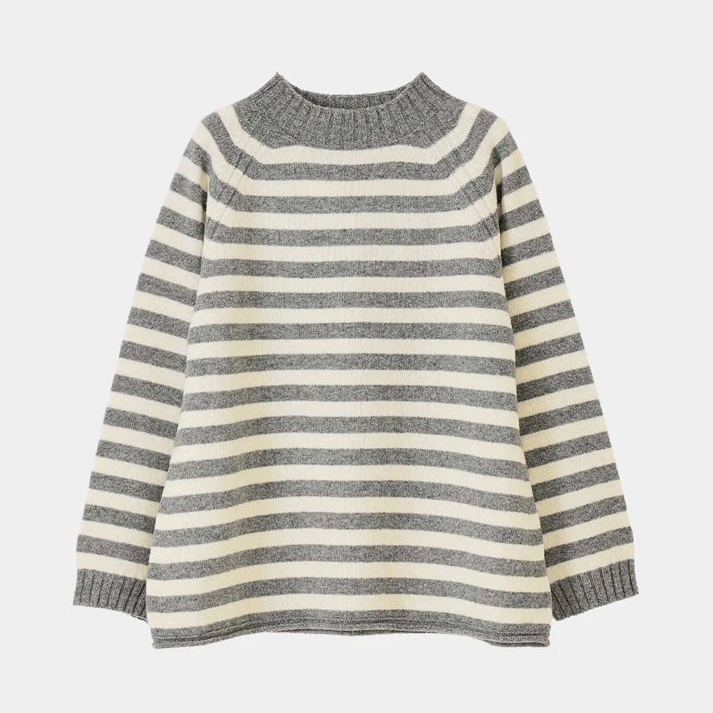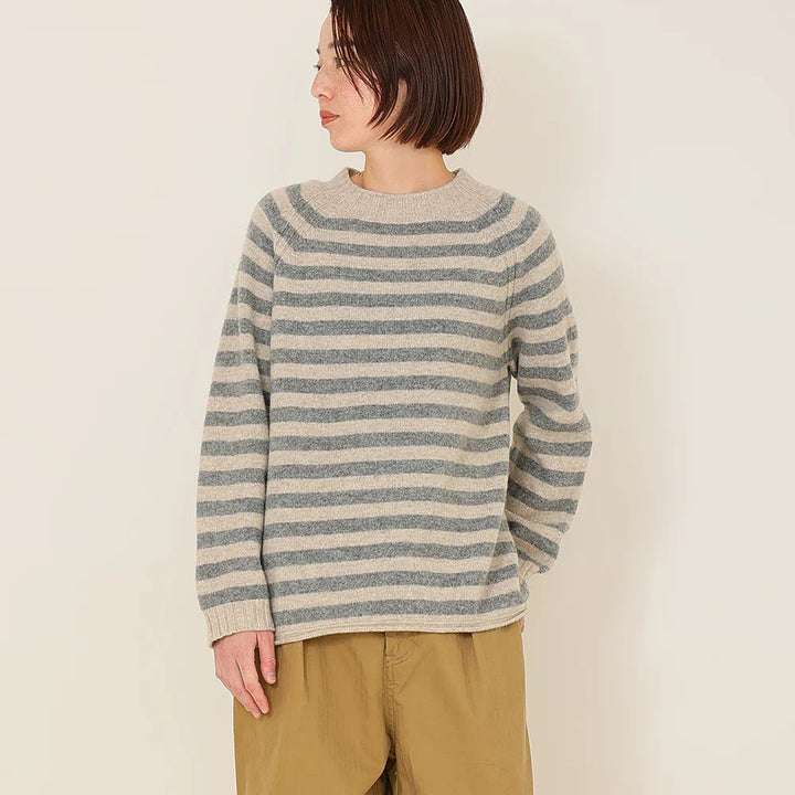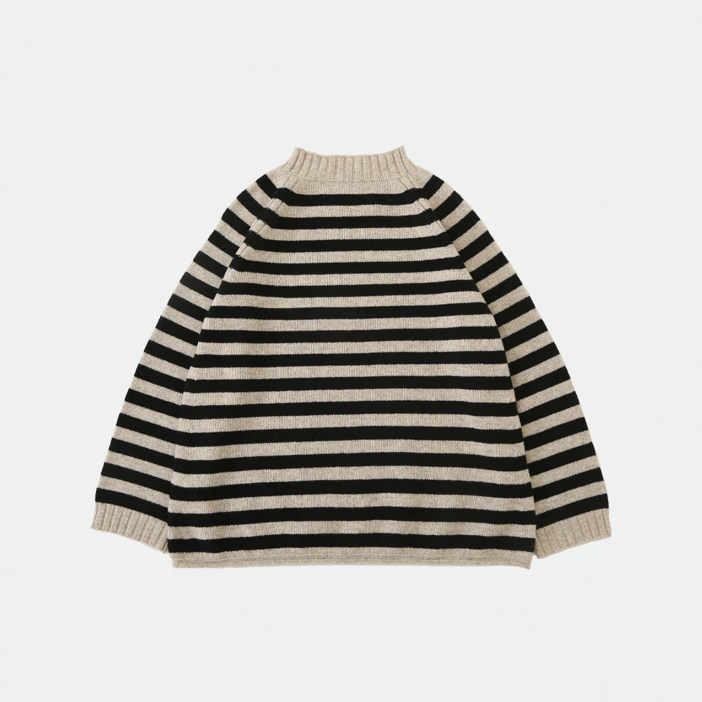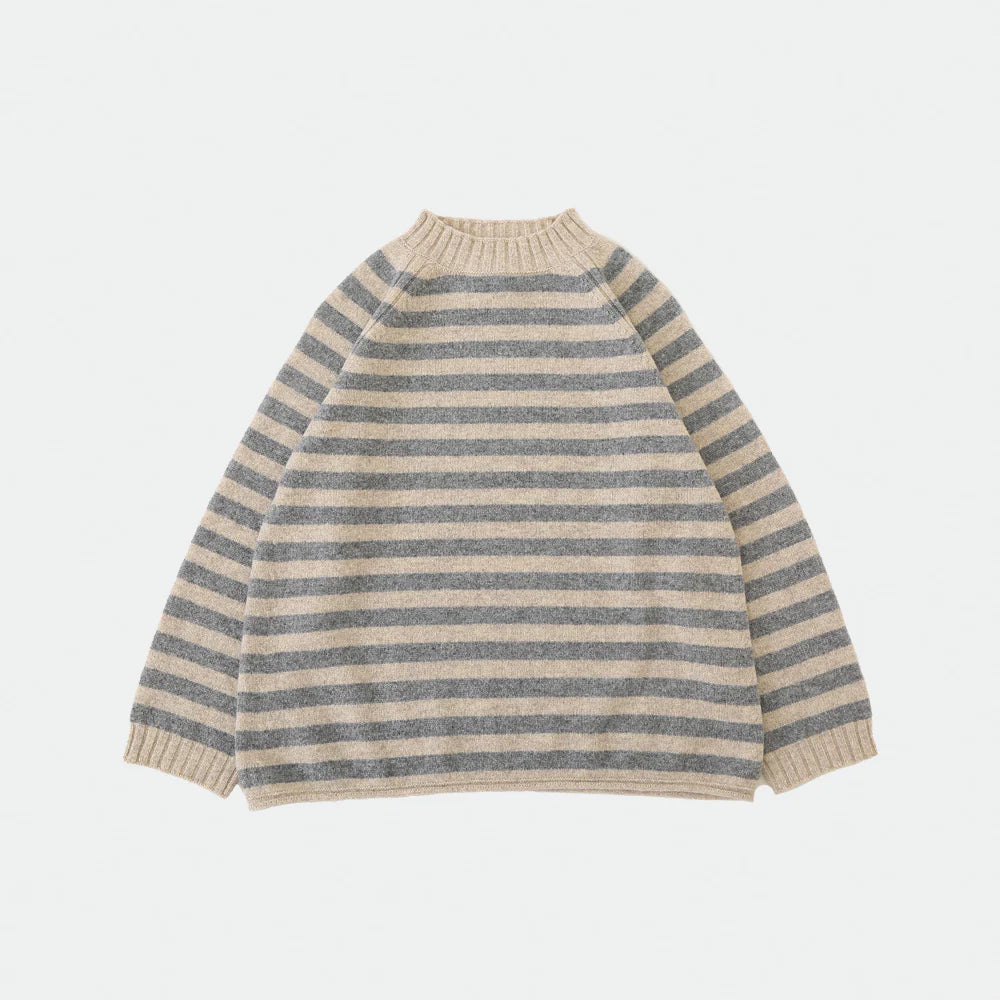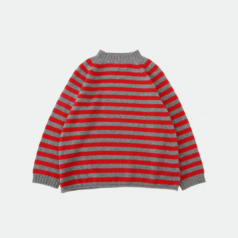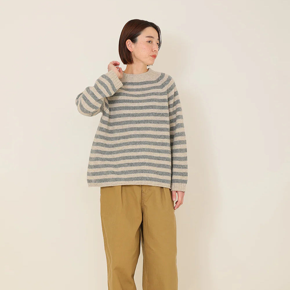 ニットの産地、群馬県太田市がより良いものづくりを掲げて生産するOTA KNIT(おおたニット)。ふんわりと柔らかく、チクチク感のない心地よい肌触りで心まで温めてくれるような、優しい着用感。しっかりとした編地は長年培われた技術だからこそ、安心してご使用頂けます。自然に立ち上がるハイネックとラグランスリーブ、ゆったりとしたシルエットは、着心地抜群。くるりと小さく巻き上がった裾がポイントです。ボーダー柄なので一枚でコーディネートの主役となるニットです。今年は何色にしましょうか?