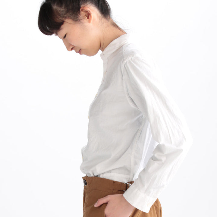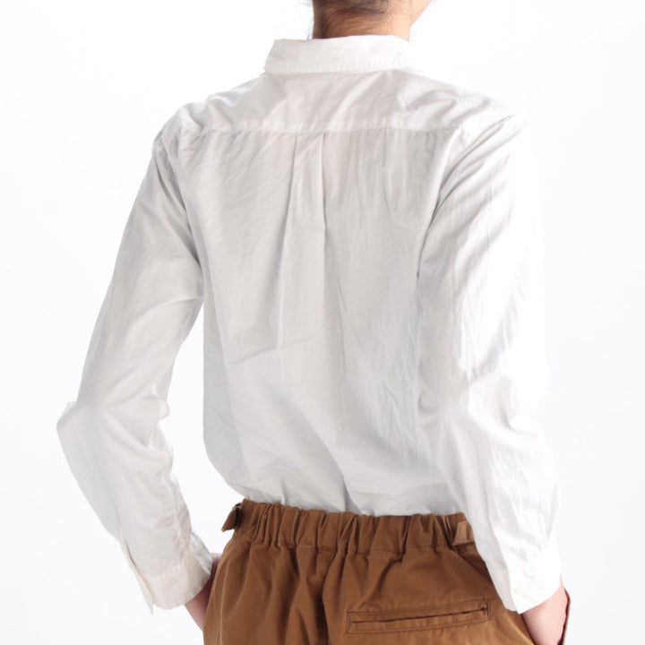 100/2の適度なハリ感のあるコットン素材を一度水洗いをして、着心地良く仕上げた素材です。アイロン無しでも、洗いざらしでパリッと程よいしわ感に。コンパクトな襟がポイントのto touchの定番シャツ。バックタック入りのベーシックなシャツに、脇につけた小さめのポケットがアクセントになっています。インしなくても、羽織のように着こなすのも素敵です。