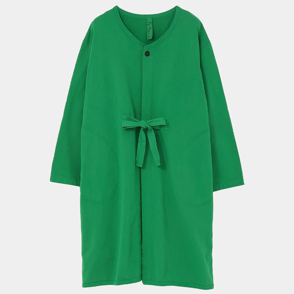 ハイゲージで編み立てられた裏毛生地。柔らかく肌馴染みの良い素材をさらに水洗いし、着心地の良さを追求しました。通年で着られるto touchの定番素材です。少し肌寒いとき、ちょっと羽織るものがほしとき、このロングカーデの出番です。ウエストの紐でシルエット調節ができて、膝まで届く着丈は着こなしやすさナンバーワン。首元のひとつボタン釦を閉めたり、ウエストの紐を結んだりと着こなしも色々楽しめます。今シーズンのカラー、グリーンは黒や白、グレーなどとも相性がよく、差し色にもなるのでお勧めです。