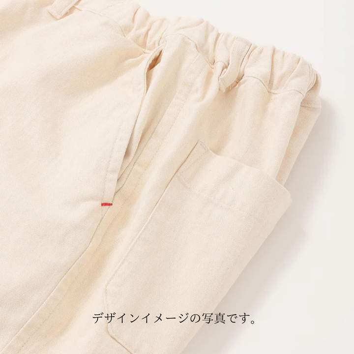 ウエスト後ろ側はベルトループ付きのゴム仕様。フロントはきちんと感がありながら、楽な履き心地です。脇ポケットに加え、後にもパッチポケットがあるのも便利。