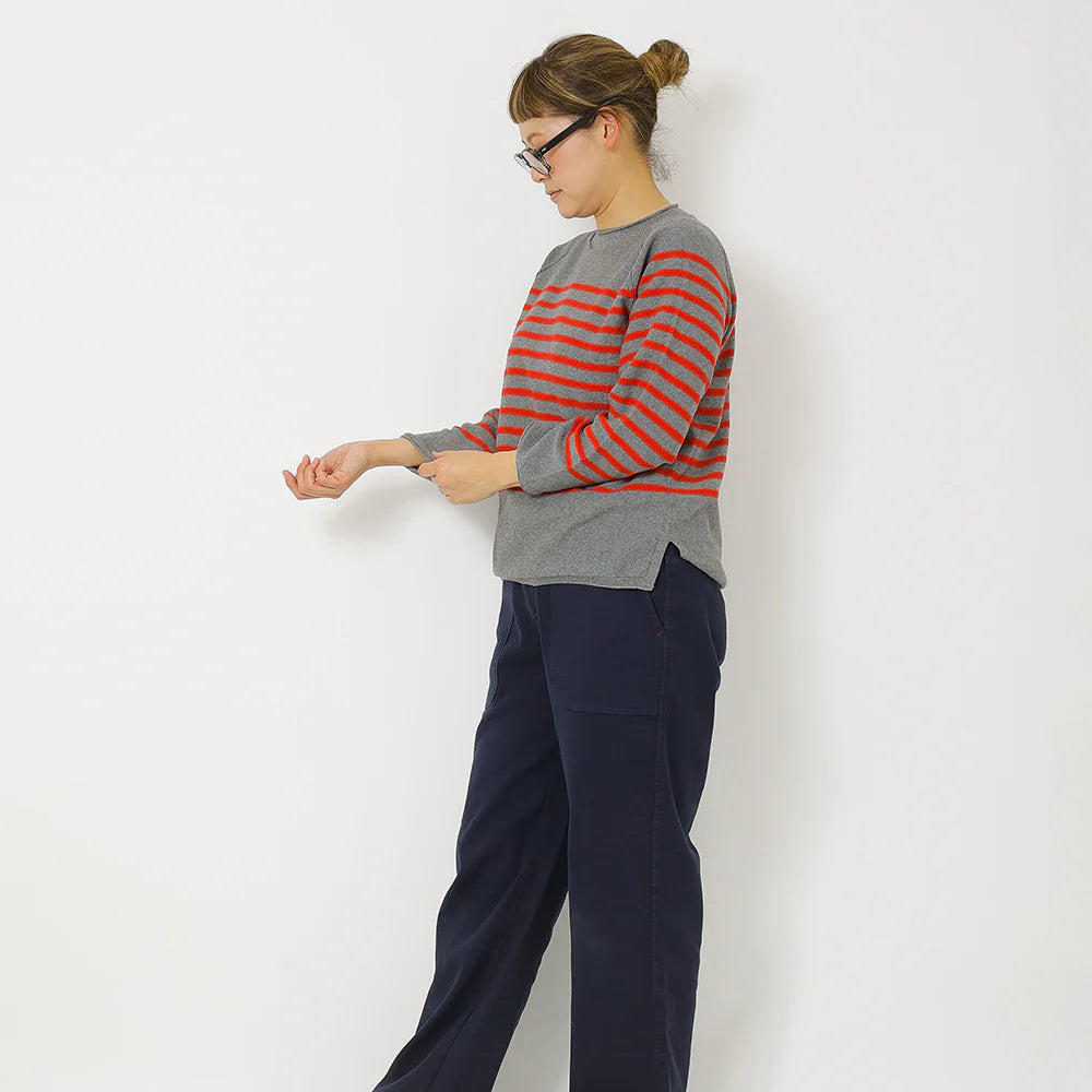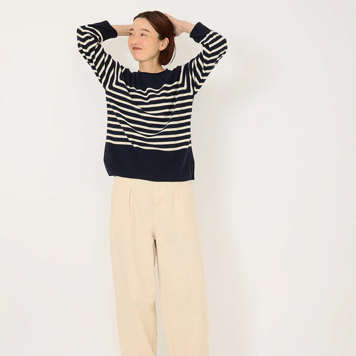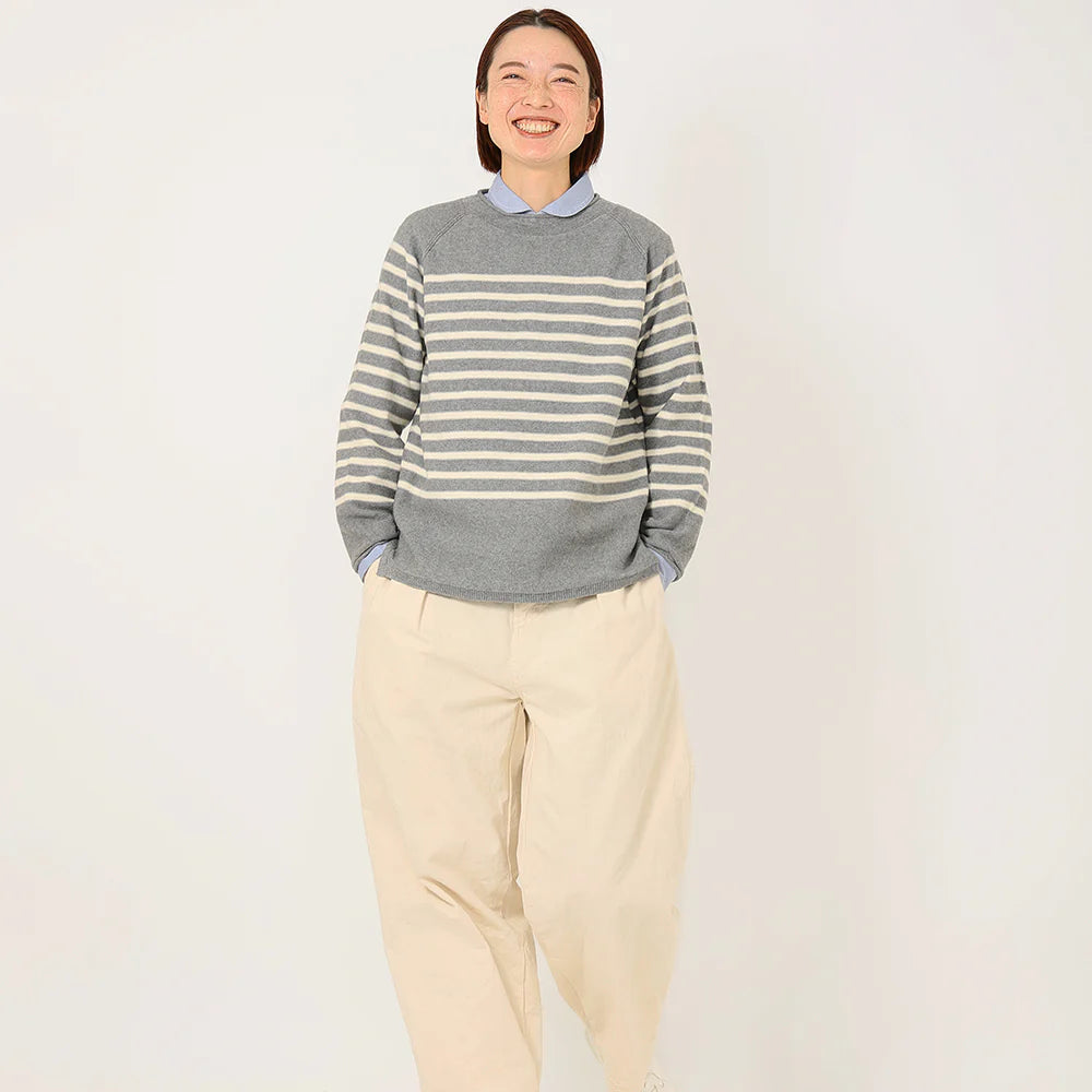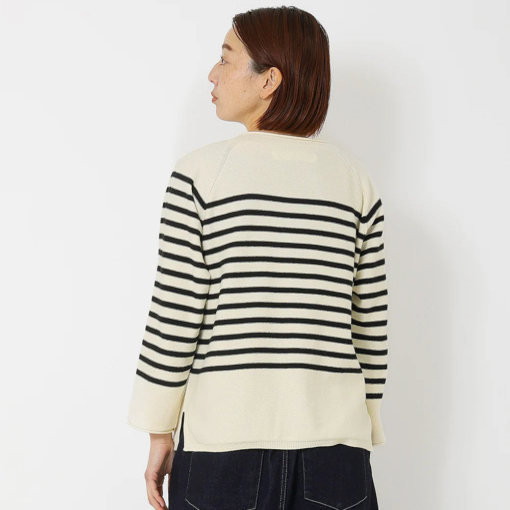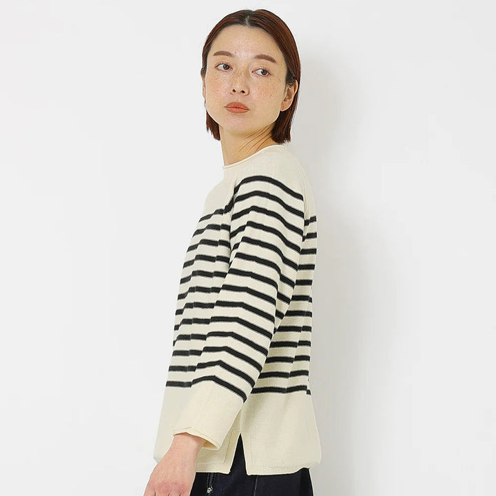 コットンに、落ち綿(おちわた)カシミヤをブレンドした糸を使用。綿の取り扱いやすさに加え、カシミヤのタッチをほんのり感じられる素材なので秋口のまだ少し暖かい時期でも、活躍できる素材です。ありそうでなかったコットンカシミヤ素材のボーダーニットが登場です。シンプルなデザインの中、裏目ボーダーなのがさりげないおしゃれポイント♪手洗い可能なのも嬉しいですね。サイドスリット入り。