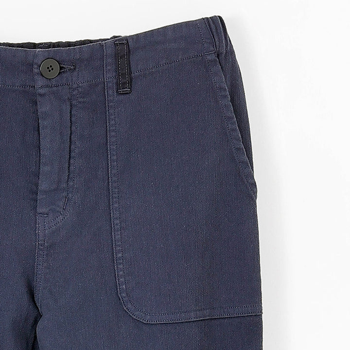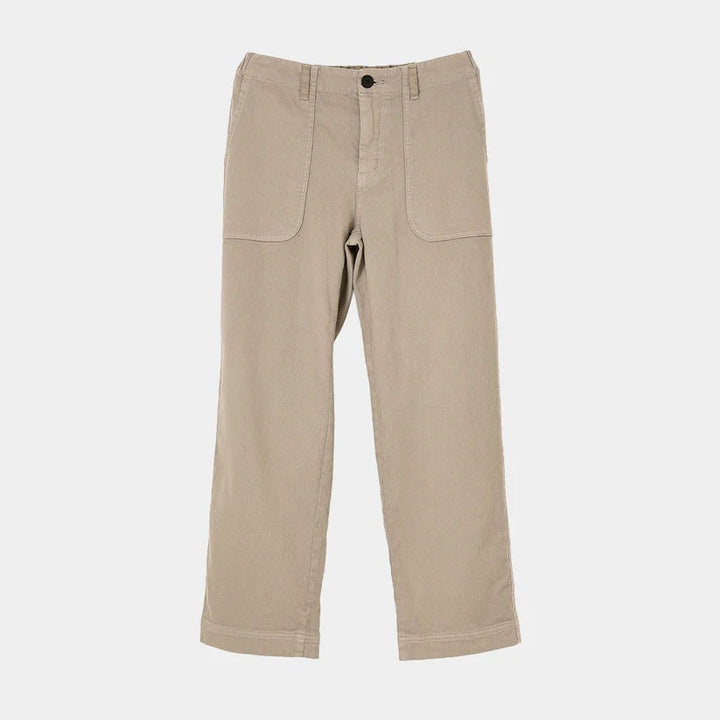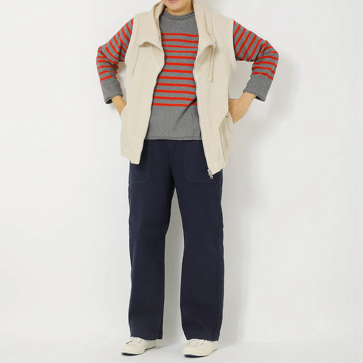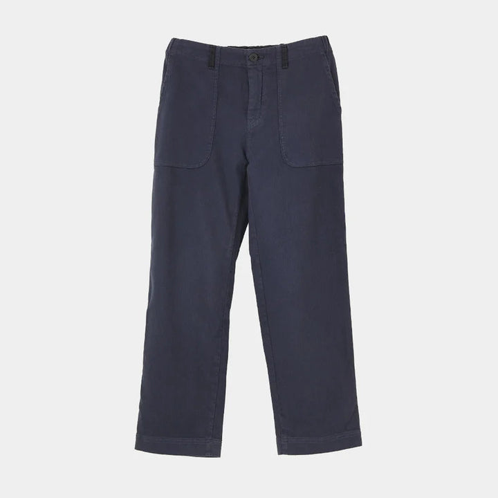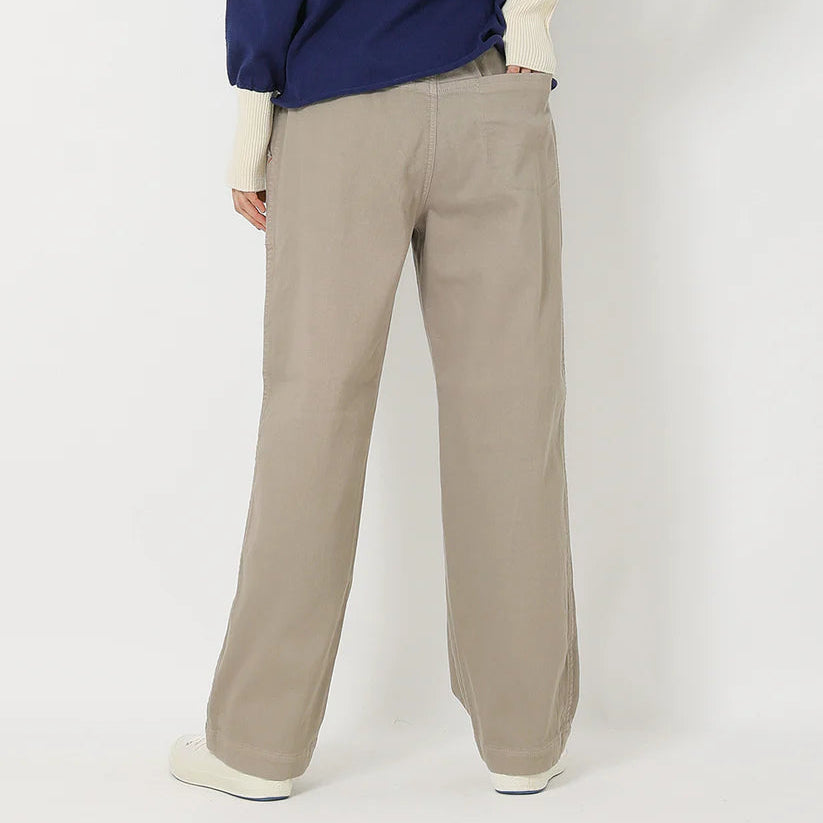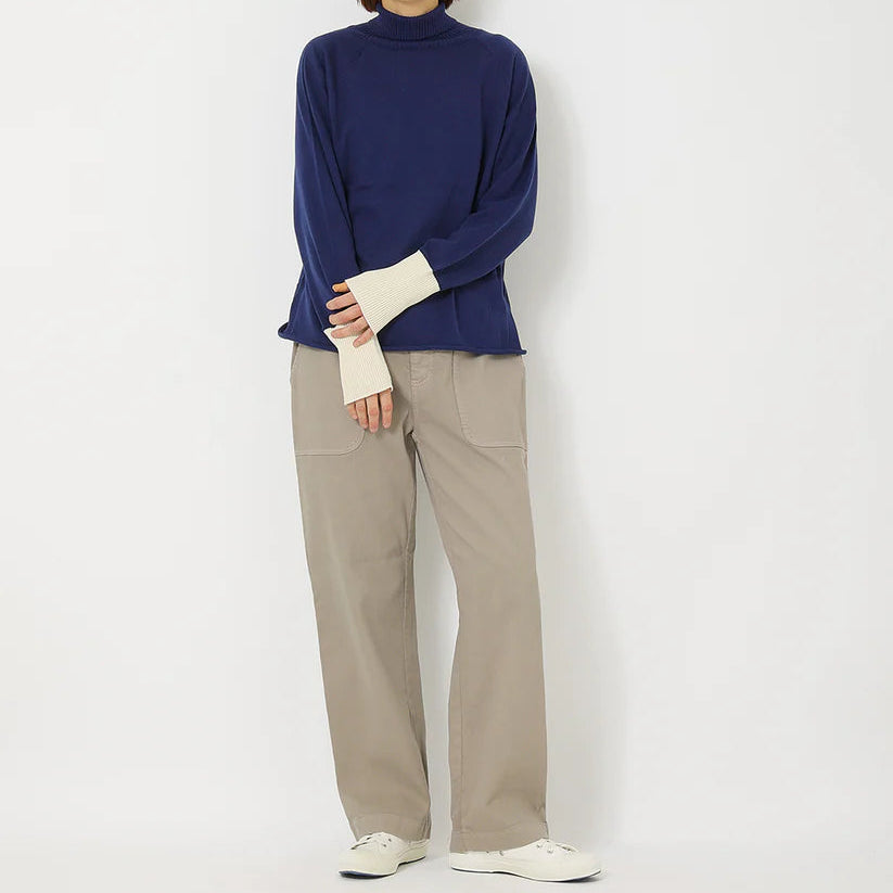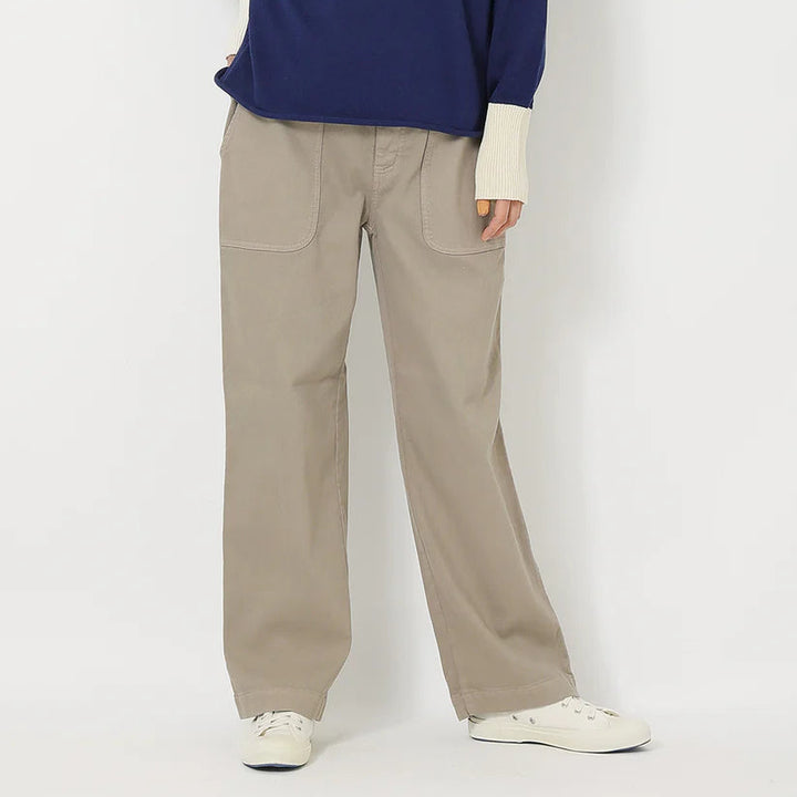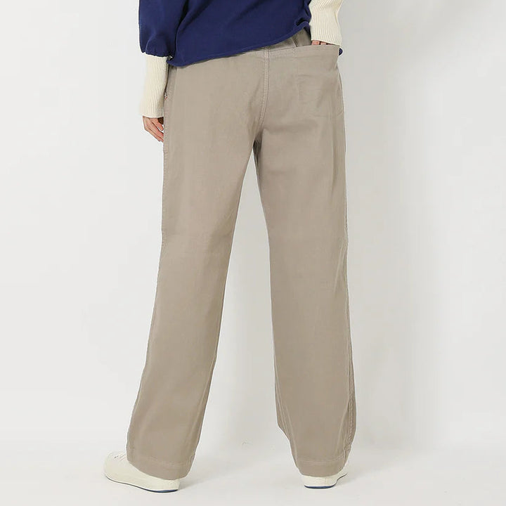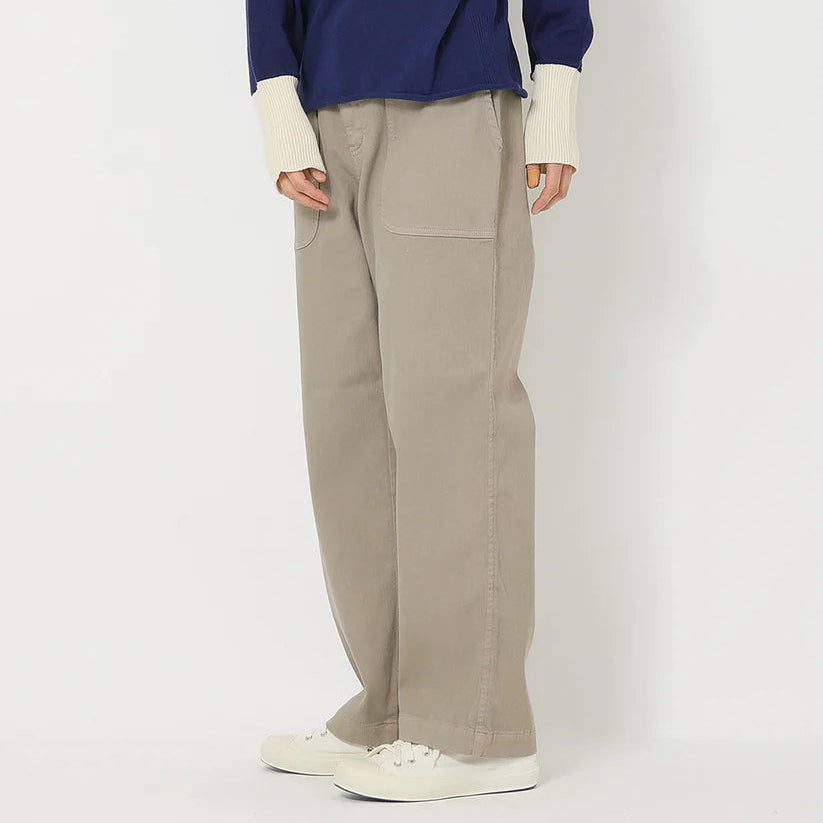 ツイル織コットンのストレッチ素材を製品染めした、柔らかな中肉素材。ゆるっとした柔らかな素材の冬のボトムス。サイドのパッチポケットがアクセントで、ウエストはゴムでゆったりと天然素材の裏起毛が心地よいボトムスです。