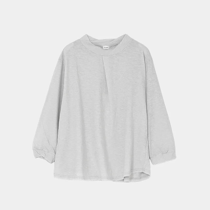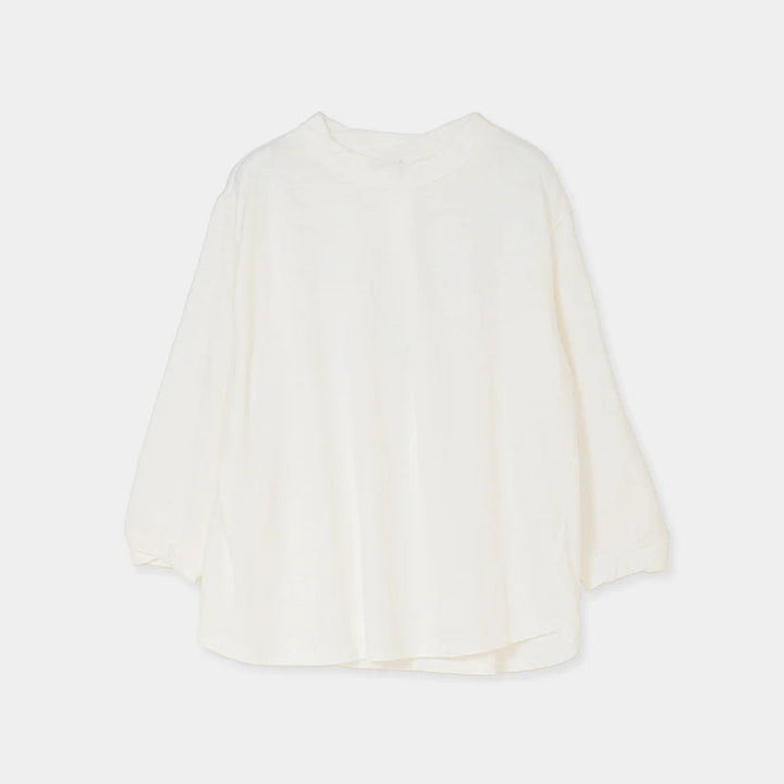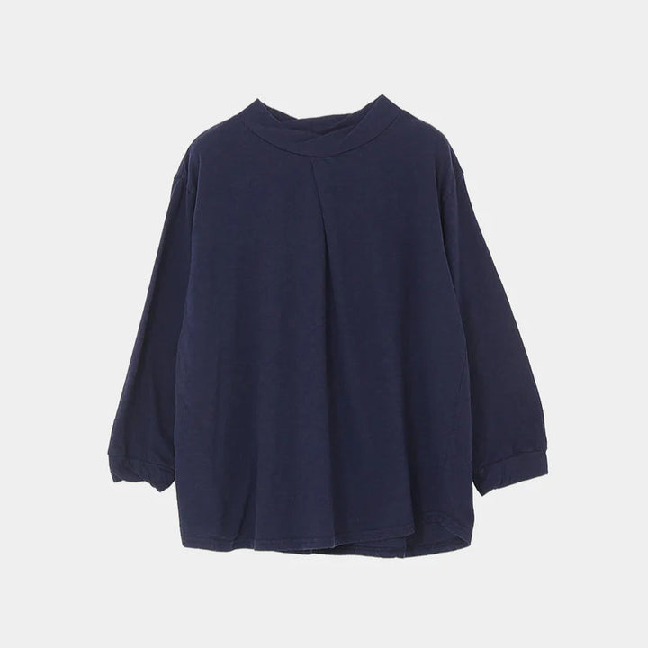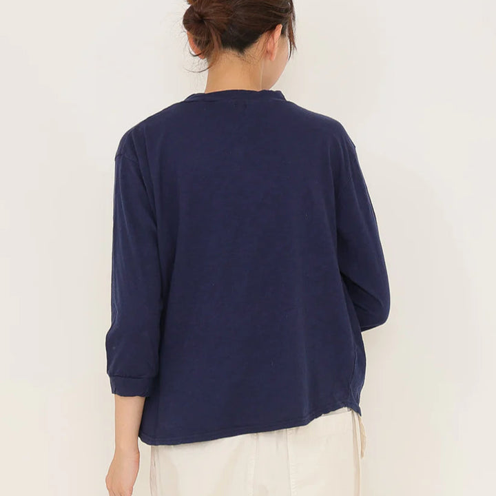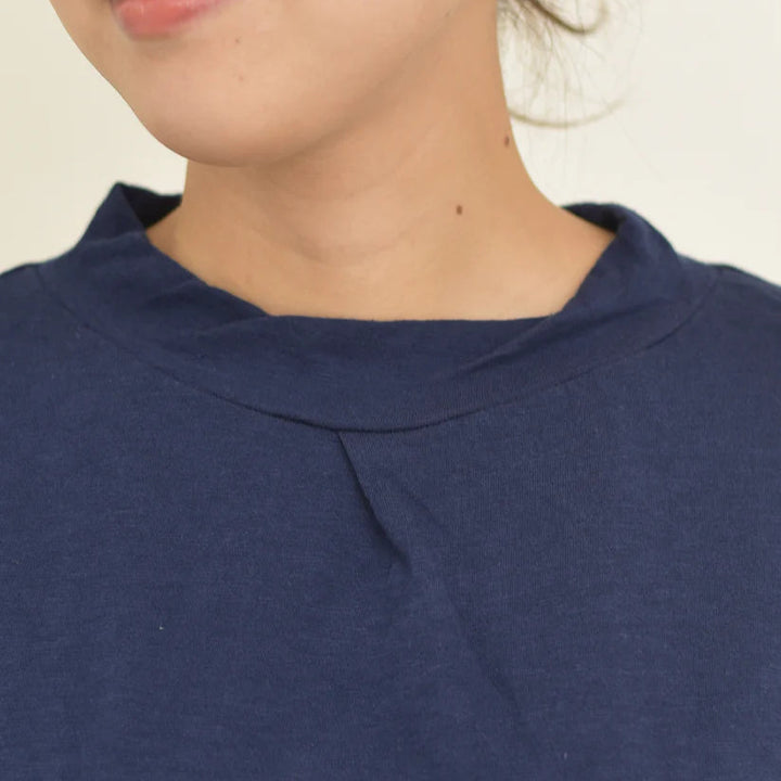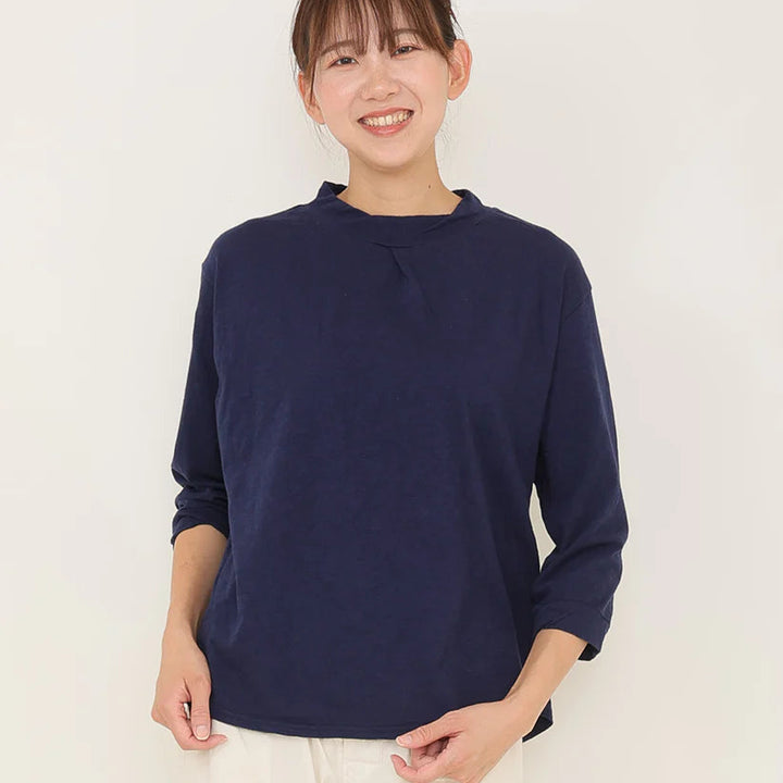細番手を使用したスラブコットンは、ラフでナチュラルな風合い。肌に優しいタッチで、心地よくずっと着ていたくなる着心地です。1枚でもインナーとしても重宝するセミタートルの7分袖Tシャツ。ひねりを入れてフワッとした襟が、首元を華やかに。少し肌寒い日のインナーとして、シャツやカーディガンなどの下にも着回せる一枚です。爽やかなカラー展開。(斜行あり)