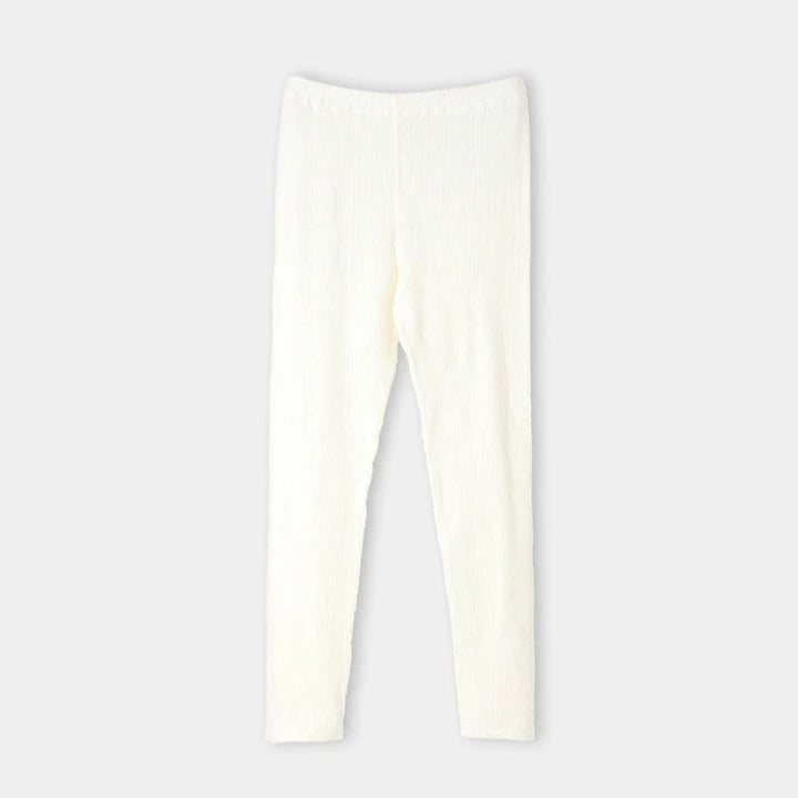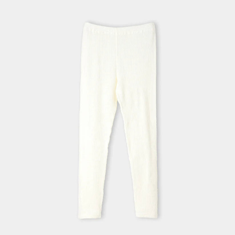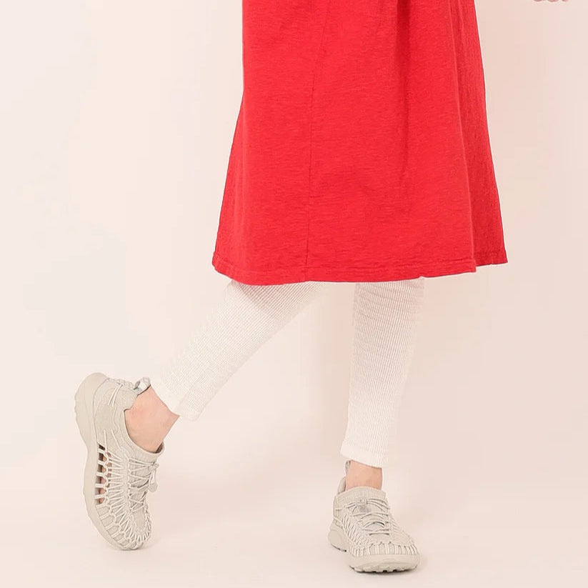 柔らかなムラ糸を使用した凹凸が特徴のテレコ素材。編み模様のボーダーがナチュラルな雰囲気に。1枚で着るのは心もとないワンピースやスカート、またはちょっとエアコンで冷えそうなとき、このスパッツの出番です。凹凸の編みが気持ちよく、年間通して履けるスパッツです。