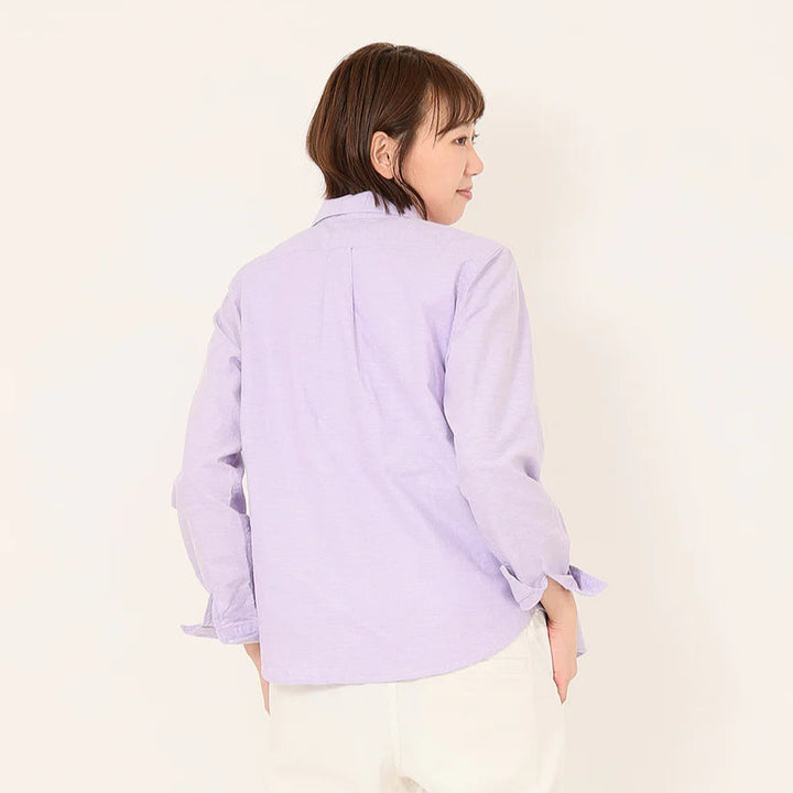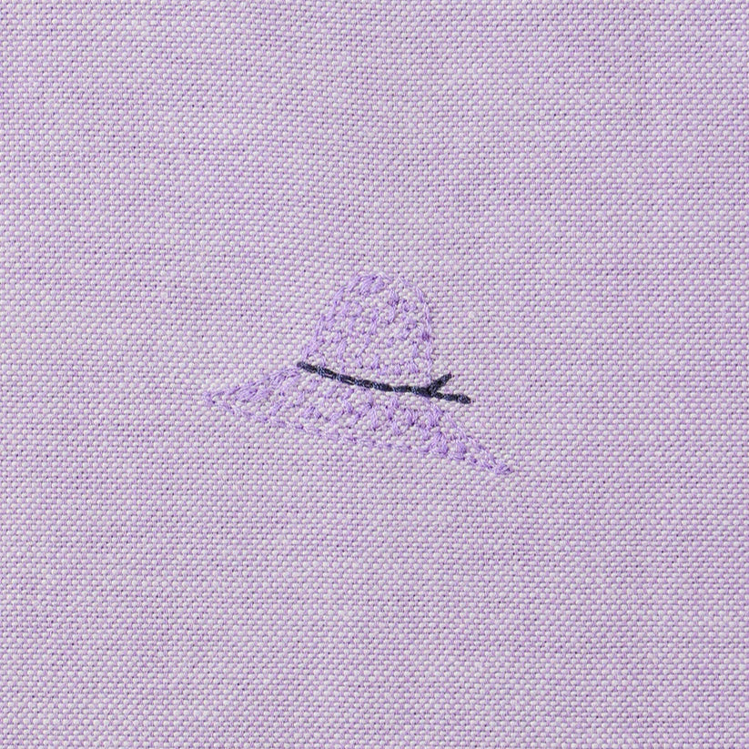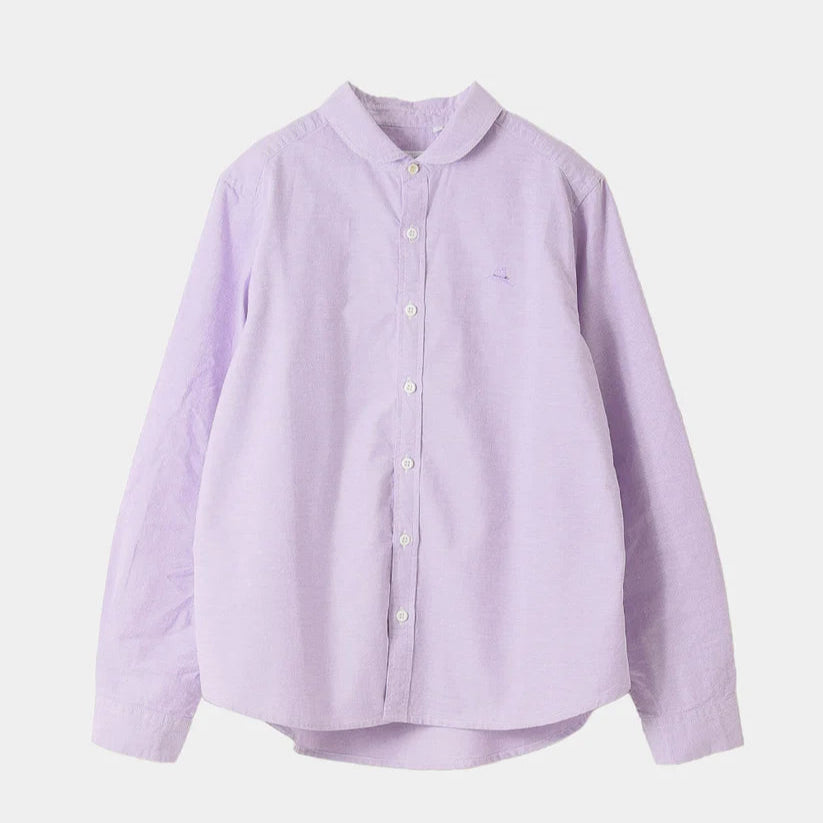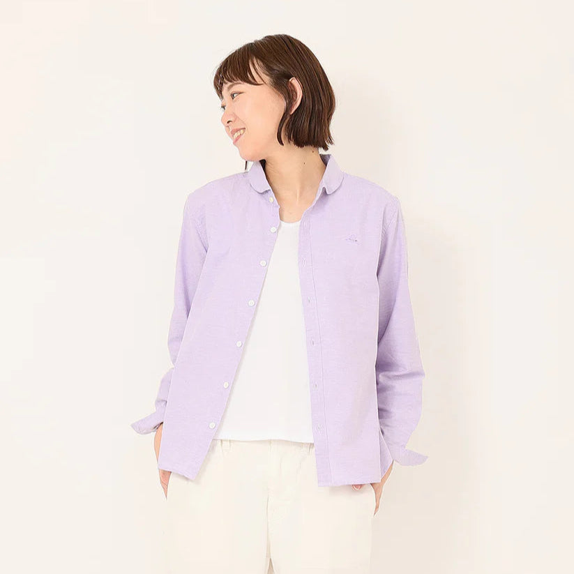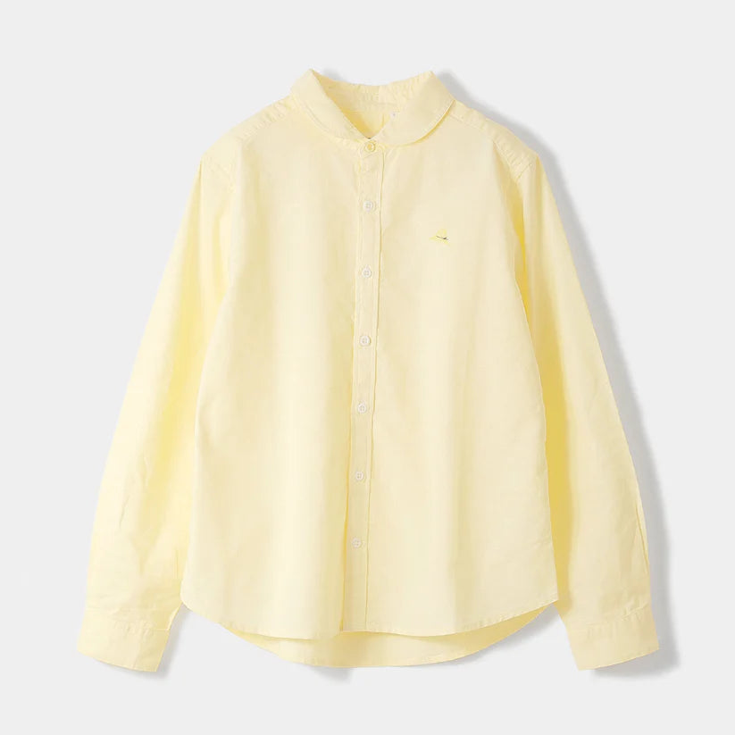 小さな丸襟のシンプルなオックスシャツに、胸元の麦わら帽子刺繍がかわいらしい。1枚で着ても羽織りとして着ても、年間活躍してくれるアイテムです。春夏にピッタリな爽やかなカラーを揃えました。