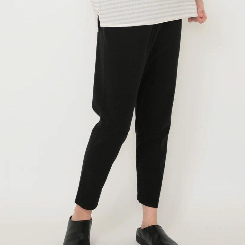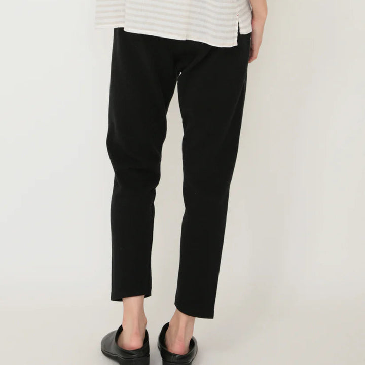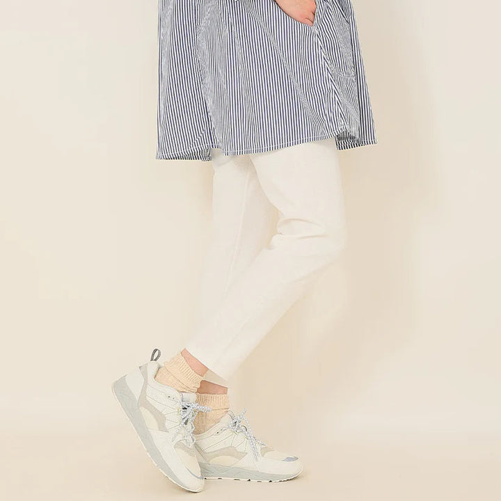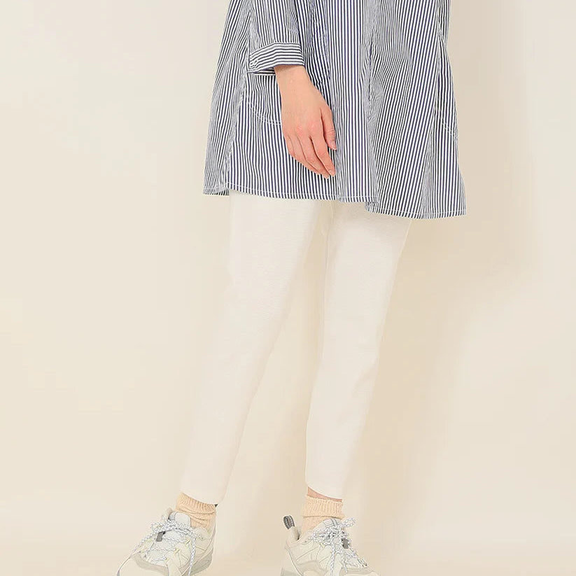 程よいストレッチ感で、季節の変わり目にちょうど良いストレッチコットン素材。リップルの凹凸感が特徴的な生地です。リップルとは「さざ波」「波紋」という意味で、布地の表面にポコポコとした立体的な模様がある生地のことです。この表面の凹凸は見た目がかわいいだけでなく、肌に張り付きにくく通気性が良いのが特徴です。生地感がしっかりとしたスパッツなので、オーバーシャツやチュニックのボトム代わりとしても重宝します。ベーシックに着回しができる4色展開です。