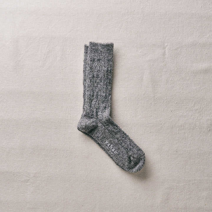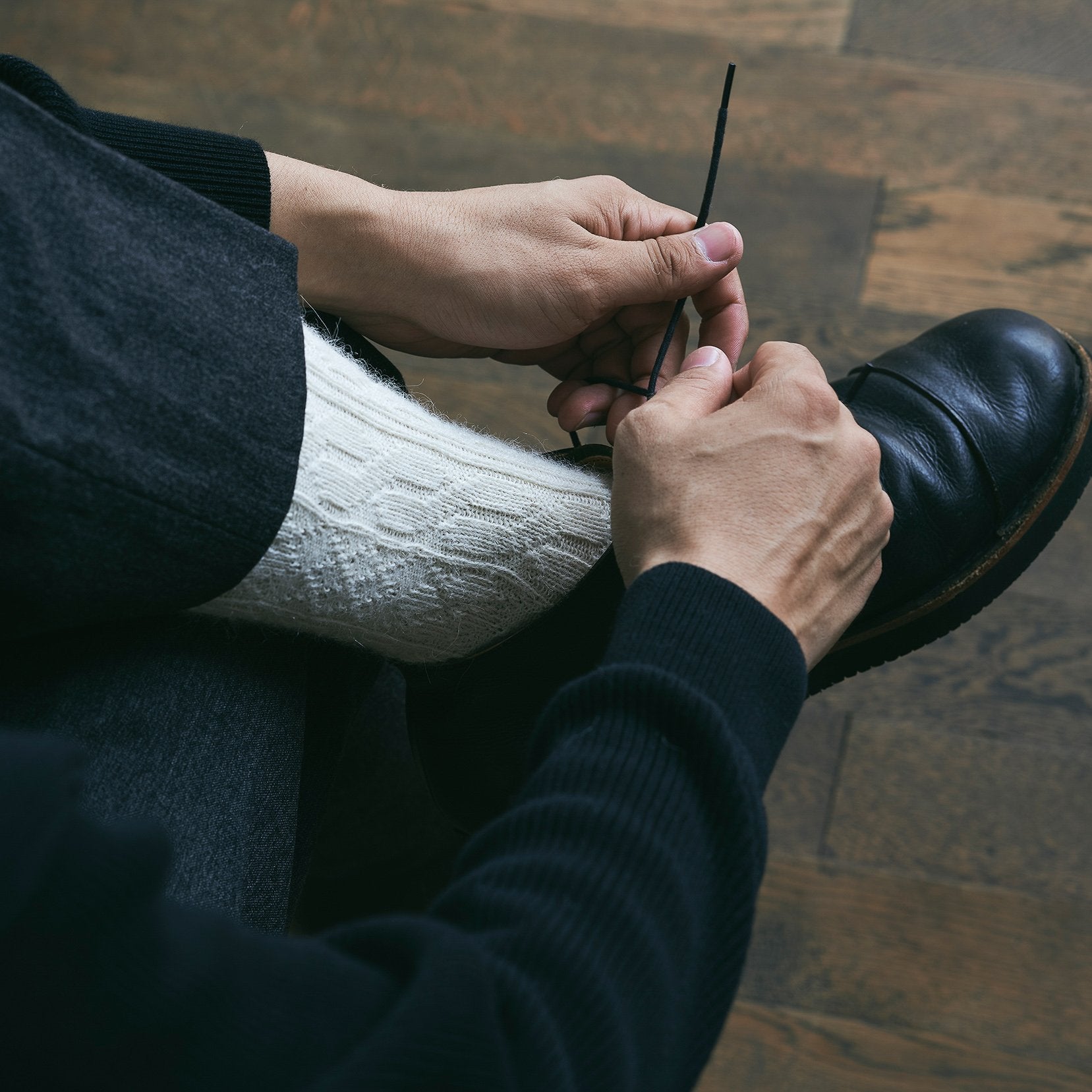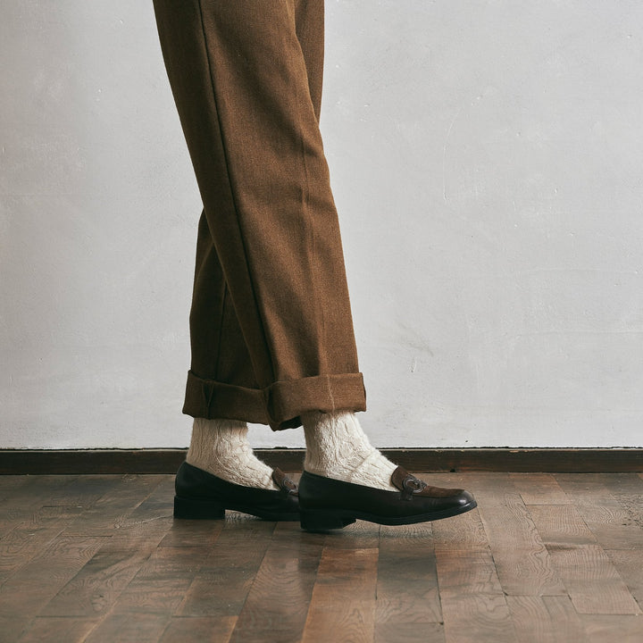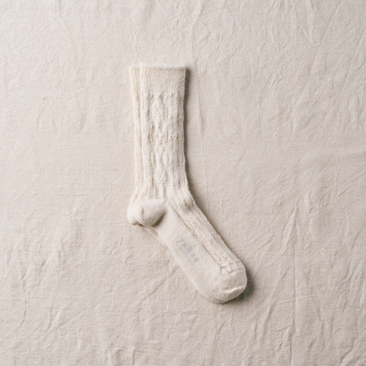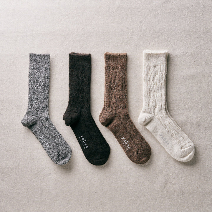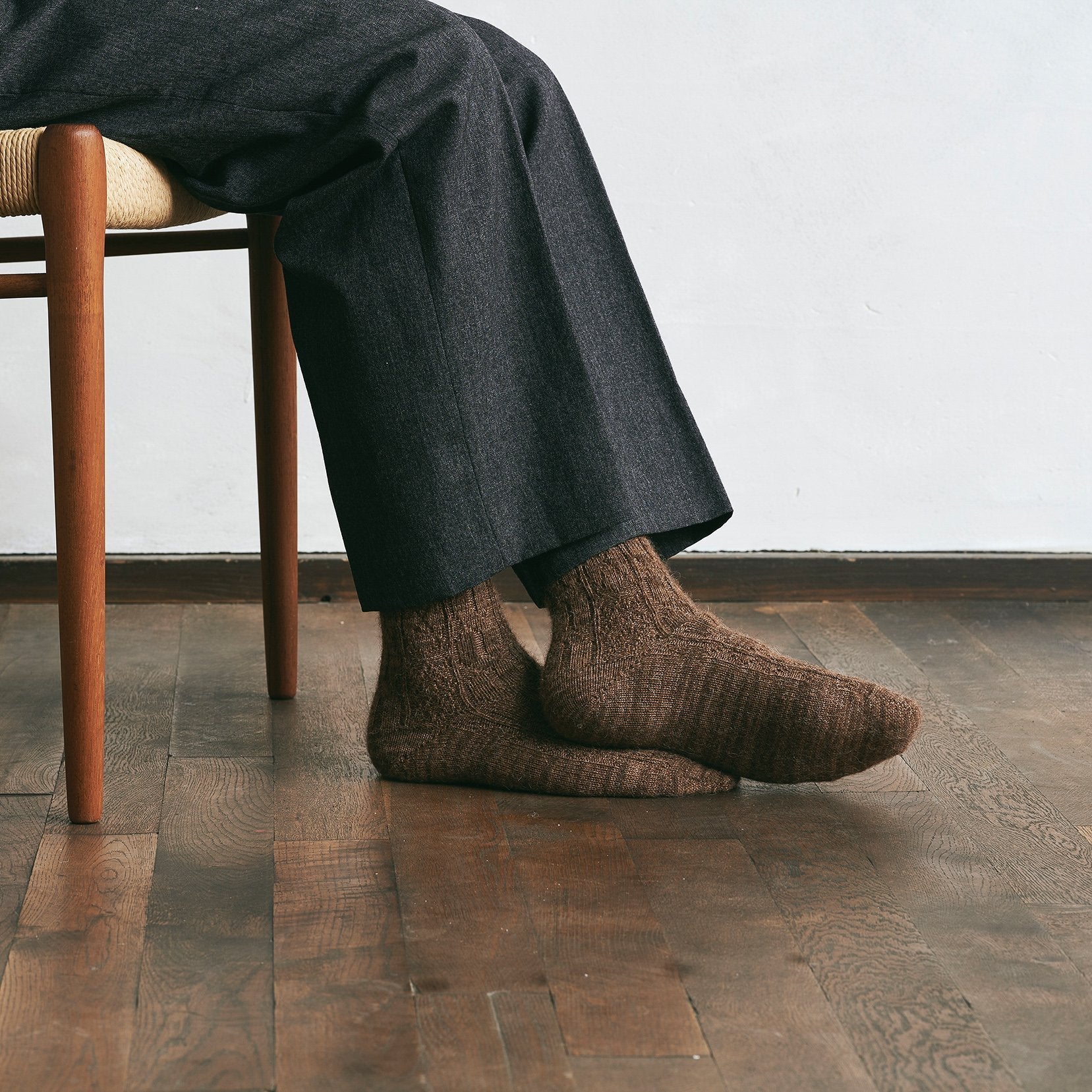 アルパカ100%の糸を使用した、旧式のダブルシリンダーの編み機で編み立てたケーブル柄のローゲージソックスです。懐かしい、レトロなケーブル柄です。